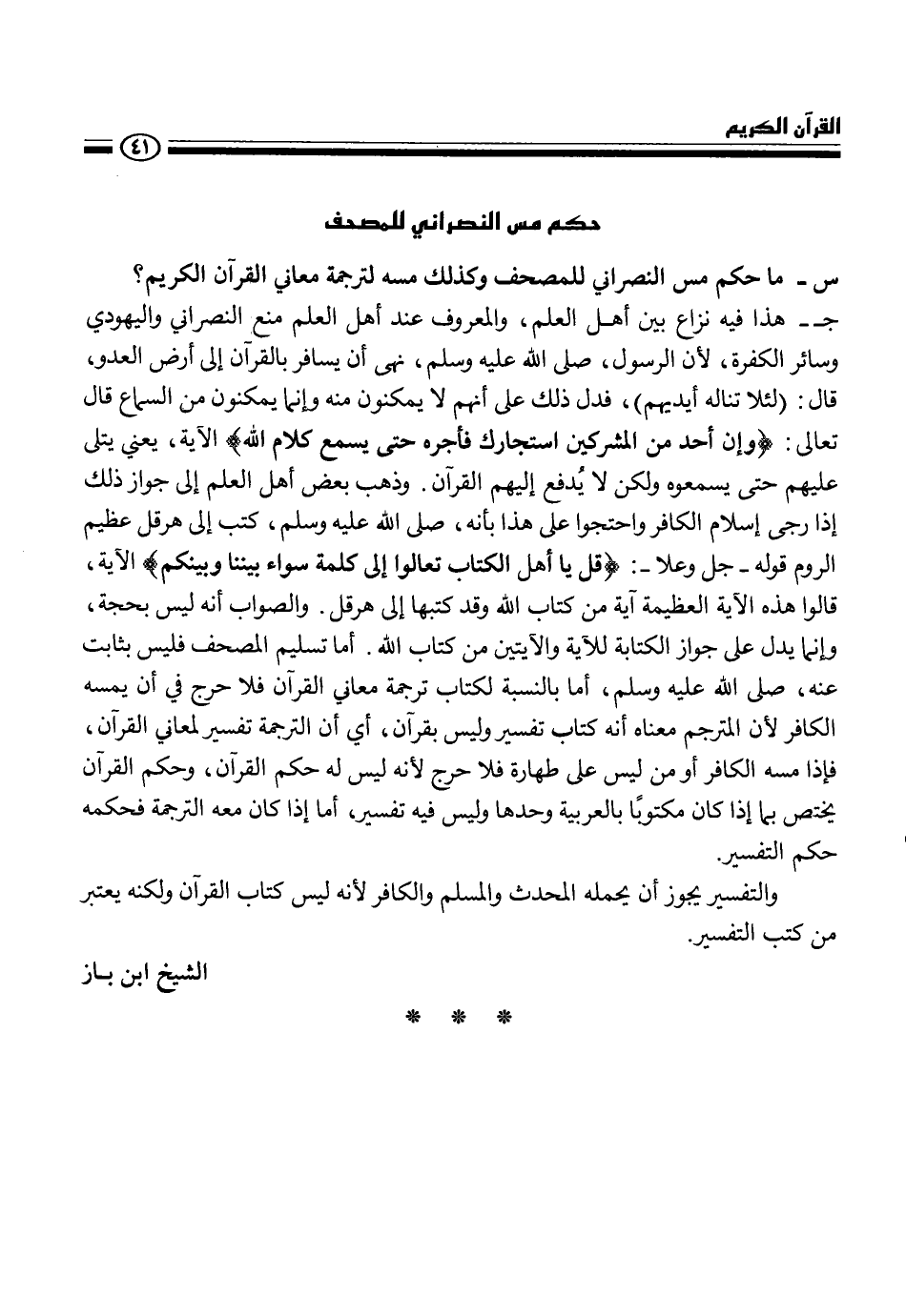 ج- هذا فيه نزاع بين أهل العلم، والمعروف عند أهل العلم منع النصراني واليهودي وسائر الكفرة، لأن الرسول، - صلى الله عليه وسلم -، نهى أن يسافر بالقرآن إلى أرض العدو، قال {لئلا تناله أيديهم} ، فدل ذلك على أنهم لا يمكنون منه وإنما يمكنون من السماع قال تعالى {وإن أحد من المشركين استجارك فأجره حتى يسمع كلام الله} . الآية. يعني يتلى عليهم حتى يسمعوه ولكن لا يدفع إليهم القرآن. وذهب بعض أهل العلم إلى جواز ذلك إذا رجى إسلام الكافر واحتجوا على هذا بأنه، - صلى الله عليه وسلم -، كتب إلى هرقل عظيم الروم قوله - جل وعلا - {قل يا أهل الكتاب تعالوا إلى كلمة سواء بيننا وبينكم} الآية، قالوا هذه الآية العظيمة آية من كتاب الله وقد كتبها على هرقل، والصواب أنه ليس بحجة، وإنما يدل على جواز الكتابة للآية والآيتين من كتاب الله. أما تسليم المصحف فليس بثابت عنه، - صلى الله عليه وسلم -، أما بالنسبة لكتاب ترجمة معاني القرآن فلا حرج في أن يمسه الكافر لأن المترجم معناه أنه كتاب تفسير وليس بقرآن، أي أن الترجمة تفسير لمعاني القرآن، فإذا مسه الكافر أو من ليس على طهارة فلا حرج لأنه ليس له حكم القرآن، وحكم القرآن يختص بما إذا كان مكتوباً بالعربية وحدها وليس فيه تفسير، أما إذا كان معه الترجمة فحكمه حكم التفسير.