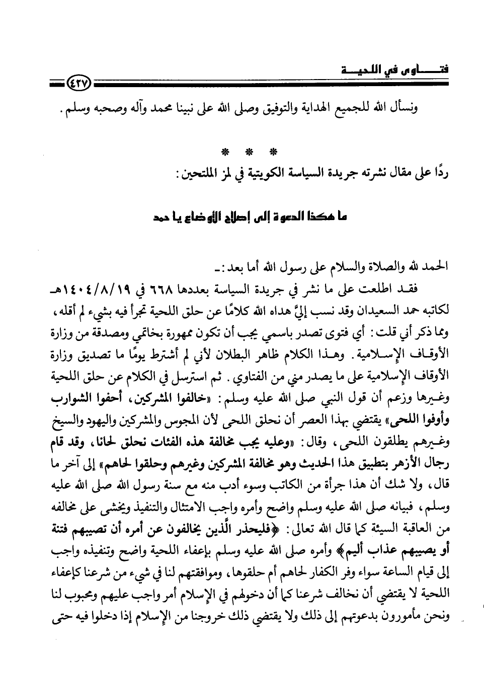 فقد اطلعت على ما نشر في جريدة السياسة بعددها 668 في 19 8 1404هـ لكاتبه أحمد السعيدانه وقد نسب إلى هداه الله كلاما عن حلق اللحية تجرأ فيه بشيء لم أقله، ومما ذكر أني قلت أي فتوى تصدر باسمي يجب أن تكون ممهورة بخاتمي ومصدقة من وزارة الأوقاف الإسلامية على ما يصدر مني من الفتاوي. ثم استرسل في الكلام عن حلق اللحية وغيرها وزعم أن قول النبي، - صلى الله عليه وسلم -، {خالفوا المشركين، أحفوا الشوارب وأوفوا اللحى} يقتضي بهذا العصر أن نحلق اللحى لأن المجوس والمشركين واليهود والسيخ وغيرهم يطلقون اللحى، وقال " عليه يجب مخالفة هذه الفئات نحلق لحانا، وقد قام رجال الأزهر بتطبيق هذا الحديث وهو مخالفة المشركين وغيرهم وحلقوا لحاهم " إلى آخر ما قال، ولا شك أن هذه جرأة من الكاتب وسوء أدب منه مع سنة رسول الله، - صلى الله عليه وسلم -، فبيانه، - صلى الله عليه وسلم -، أوضح وأمره واجب الامتثال والتنفيذ ويخشى على مخالفة من العاقبة السيئة كما قال الله تعالى {فليحذر الذين يخالفون عن أمره أن تصيبهم فتنة أو يصيبهم عذاب أليم} وأمره صلى الله عليه وسلم بإعفاء اللحية واضح وتنفيذه واجب إلى قيام الساعة سواء وفر الكفار أم حلقوها، وموافقتهم لنا في شيء من شرعنا كإعفاء اللحية لا يقتضي أن نخالف شرعنا كما أن دخولهم في الإسلام أمر واجب عليهم ومحبوب لنا ونحن مأمورين بدعوتهم إلى ذلك ولا يقتضي ذلك خروجنا من الإسلام إذا دخلوا فيه حتى