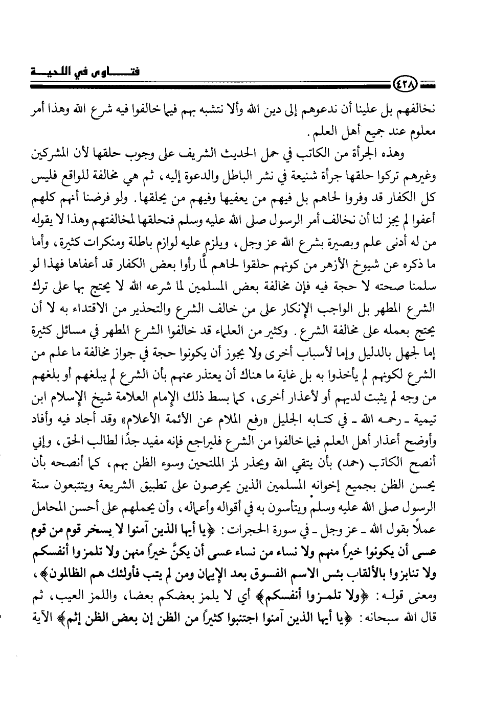 وهذه الجرأة من الكتاب في حمل الحديث الشريف على وجوب حلقها لأن المشركين وغيرهم تركوا حلقها جرأة شنيعة في نشر الباطل والدعوة إليه، ثم هي مخالفة للواقع فليس كل الكفار قد وفروا لحاهم بل فيهم من يعفيها وفيهم من يحلقها، ولو فرضنا أنهم كلهم أعفوا لم يجز لنا أن نخالف أمر الرسول، - صلى الله عليه وسلم -، فنحلقها لمخالفتهم وهذا لا يقوله من له أدنى علم وبصيرة بشرع الله عز وجل، ويلزم عليه لوازم باطلة ومنكرات كثيرة، وأما ما ذكره عن شيوخ الأزهر من كونهم حلقال لحاهم لما رأووا بعض الكفار قد أعفاها فهذا لو سلمنا صحته لا حجة فيه فإن مخالفة بعض المسلمين لما شرعه الله لا يحتج بها على ترك الشرع المطهر بل الواجب الإنكار على من خالف الشرع والتحذير من الإقتداء به لا أن يحتج بعمله على مخالفة الشرع، وكثير من العلماء قد خالفوا الشرع المطهر في مسائل كثيرة إما لجهل بالدليل وإما لأسباب أخرى ولا يجوز أن يكونا حجة في جواز مخالفة ما علم من الشرع لكونهم لم يأخذوا به بل غاية ما هناك أن يعتذر عنهم بأن الشرع لم يبلغهم أو بلغهم من وجه لم يثبت لديهم أو لأعذار أخرى، كما بسط ذلك الإمام العلامة شيخ الإسلام ابن تيمية - رحمه الله - في كتابه الجليل " رفع الملام عن الأئمة الأعلام " وقد أجاد فيه وأفاد وأوضح أعذار أهل العلم فيما خالفوا من الشرع فليراجع فإنه مفيد جداً لطالب الحق، وإني أنصح الكاتب (أحمد) بأن يتقي الله ويحذر لمز الملتحين وسوء الظن بهم، كما أنصحه بأن يحسن الظن بجميع إخوانه المسلمين الذي يحرصون على تطبيق الشريعة ويتتبعون سنة الرسول، - صلى الله عليه وسلم -، ويتأسون به في أقواله وأعماله، وأن يحملهم على أحسن المحامل عملاً بقول الله - عز وجل - في سورة الحجرات {يا أيها الذين آمنوا لا يسخر قوم من قوم عسى أن يكونواً خيراًَ منهم ولا نساء من نساء عسى أن يكن خيراً منهن ولا تلمزوا أنفسكم ولا تنابزوا بالألقاب بئس الاسم الفسوق بعد الإيمان ومن لم يتب فأولئك هم الظالمون} .