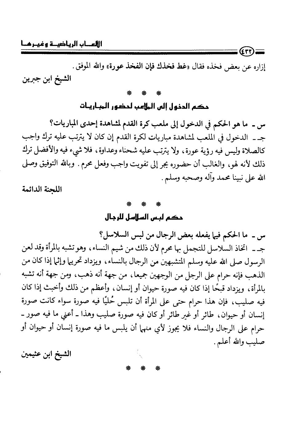 ج- اتخاذ السلاسل للتجمل بها محرم لأن ذلك من شيم النساء، وهو تشبه بالمرأة وقد لعن الرسول، - صلى الله عليه وسلم -، المتشبهين من الرجال بالنساء، ويزداد تحريما وإثما إذا كان من الذهب فإنه حرام على الرجل من الوجهين جميعاً، من جهة أنه ذهب، ومن جهة إنه تشبه بالمرأة، ويزداد قبحاً إلا كان فيه صورة حيوان أو إنسان، وأعظم من ذلك وأخبث إذا كان فيه صليب، فإن هذا حرام حتى على المرأة أن تلبس حلياً فيه صورة سواء كانت صورة إنسان أو حيوان، طائر أو غير طائر أو كان فيه صورة صليب وهذا - أعنى ما فيه صورة حرام على الرجال والنساء فلا يجوز لأي منهما أن يلبس ما فيه صورة إنسان أو حيوان أو صليب والله أعلم.