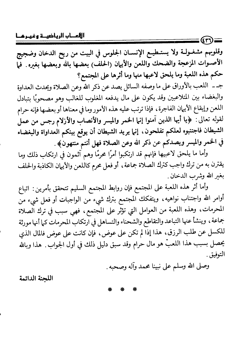 وقلوبهم مشغولة ولا يستطيع الإنسان الجلوس في البيت من ريح الدخان وضجيج الأصوات المزعجة والضحك واللعن والإيمان (الحلف) بعضها بالله وبعضها بغيره، فما حكم هذه اللعبة وما يحلق لاعبها منها وأما أثرها على المجتمع؟