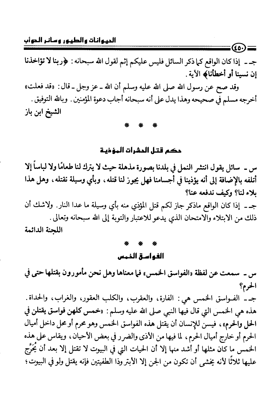 ج- الفواسق الخمس هي الفارة، والعقرب، والكلب العقور، والغراب، والحداة. هذه هي خمس التي قال فيها النبي، - صلى الله عليه وسلم - {خمس كلهن فواسق يقتلن في الحل والحرم} ، فيسن للإنسان أن يقتل هذ الفواسق الخمس وهو محرم ومحل داخل أميال الحرم أو خارج أميال الحرم، لما فيها من الأذى والضرر في بعض الأحيان، ويقاس على هذه الخمس ما كان مثلها أو أشد منها إلا أن الحيات التي في البيوت لا تقتل إلا بعد أن يخرج عليها ثلاثاً لأنه يخشى أن تكون من الجن، إلا الأبتر وذا الطفيتين فإنه يقتل ولو في البيوت،