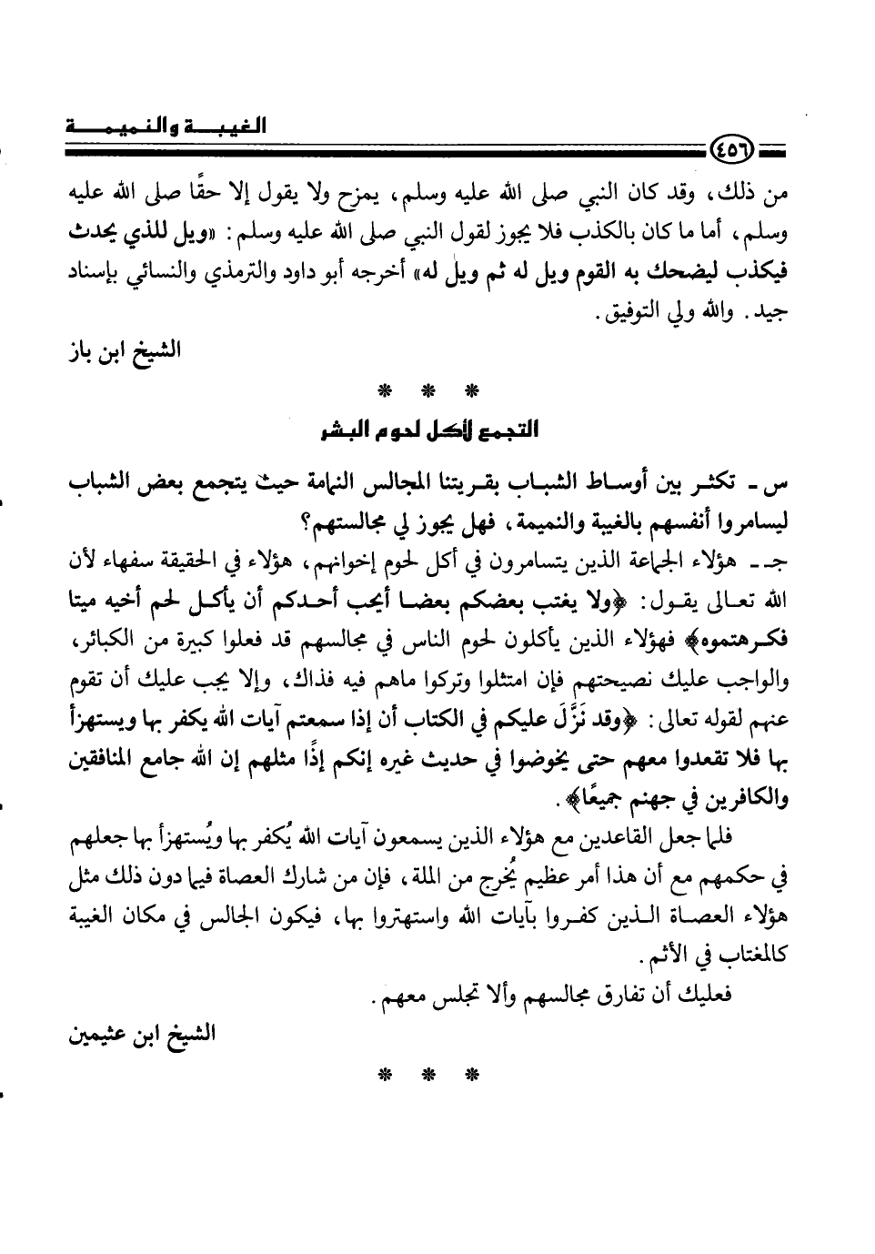 ج- هؤلاء الجماعة الذين يتسامرون في آكل لحوم أخوانهم، هؤلاء في الحقيقة سفهاء لأن الله تعالى يقول {ولا يغتب بعضكم بعضاً أيحب أحدكم أن يأكل لحم أخيه ميتا فكرهتموه} فهؤلاء الذين يأكلون لحوم الناس في مجالسهم قد فعلوا كبيرة من الكبائر، والواجب عليك نصحيتهم فإن امتثلوا وتركوا ما هم فيه فذاك، وإلا يجب عليك أن تقوم عنهم لقوله تعالى {وقد نزل عليكم في الكتاب في الكتاب أن إذا سمعتم آيات الله يكفر بها ويستهزأ بها فلا تقعدوا معهم حتى يخوضا في حديث غيره إنكم إذا مثلهم إن الله جامع المنافقين والكافرين في جهنم جميعاً} .
