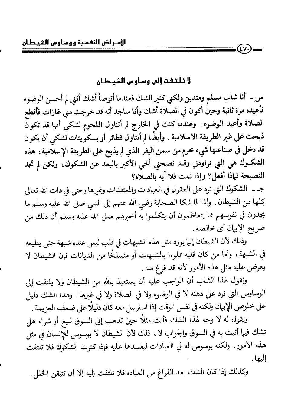 ونقول له لا وجه لهذا الشك فأنت مثلاً حين تذهب إلى السوق لبيع أو شراء هل تشك فيما أتيت به من السوق والجواب لا، ذلك لأن الشيطان لا يوسوس للإنسان في مثل هذه الأمور. ولكنه يوسوس له في العبادات ليفسدها عليه فإذا كثرت الشكوك فلا تلتفت إليها.