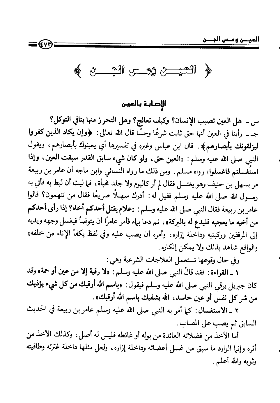 ج- رأينا في العين أنها حق ثابت شرعاً وحساً قال الله تعالى {وإن يكاد الذين كفروا ليزلقونك بأبصارهم} . قال ابن عباس وغيره في تفسيرها أي يعينوك بأبصارهم، ويقول النبي، - صلى الله عليه وسلم -، {العين حق، ولو كان شيء سابق القدر سبقت العين، وإذا استغسلتم فاغسلوا} رواه مسلم، ومن ذلك ما رواه النسائي وابن ماجه أن عامر بن ربيعة مر بسهل بن حنيف وهو يغتسل فقال لم أر كاليوم ولا جلد مخبأة، فما لبث أن لبط به فأتي به رسول الله، - صلى الله عليه وسلم -، فقيل له أدرك سهلاً صريعاً فقال من تتهمون؟ قالوا عامر بن ربيعة فقال النبي، - صلى الله عليه وسلم -، {علام يقتل أحدكم أخاه؟ إذا رأى أحدكم من أخيه ما يعجبه فليدع له بالبركة} ثم دعا بماء فأمر عامراً أن يتوضاً فيغسل وجهه ويديه إلى المرفقين وركبتيه وداخله إزاره، وأمره أن يصب عليه وفي يكفأ الإناء من خلفه " والواقع شاهد بذلك ولا يمكن إنكاره.
