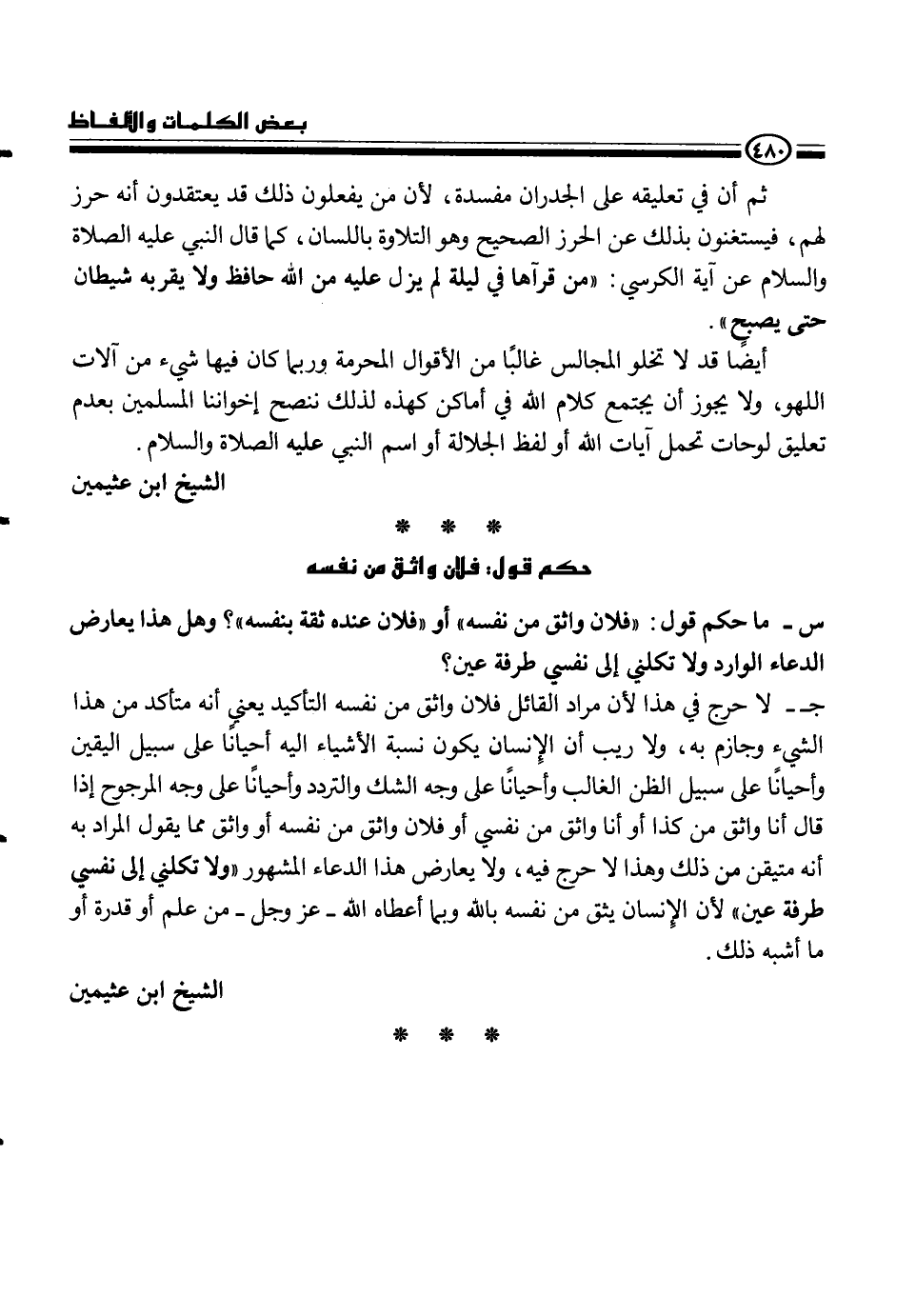 ج- لا حرج في هذا لأن مراد القائل فلان واثق من نفسه التأكيد يعني أنه متأكد من هذا الشيء وجازم به، ولا ريب أن الإنسان يكون نسبة الأشياء إليه أحياناً على سبيل اليقين وأحياناً على سبيل الظن العالب وأحيانا على وجه الشك والتردد وأحياناً على وجه المرجوح إذا قال أنا واثق من كذاة أو أنا واثق من نفسي أو فلان واثق من نفسه أو واثق مما يقول المراد به أنه متيقن من هذا ولا حرج فيه، ولا يعارض هذا الدعاء المشهور {ولا تكلني إلى نفسي طرفة عين} لأن الإنسان يثق من نفسه بالله وبما أعطاه الله - عز وجل - من علم أو قدرة أو ما أشبه ذلك.