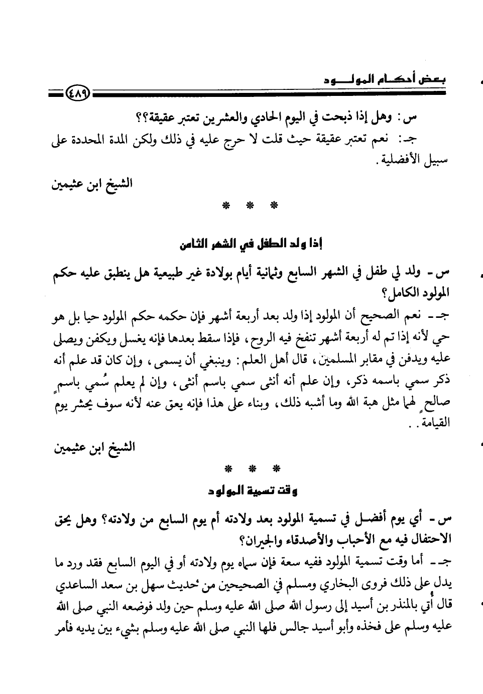 ج- أما وقت تسمية فقيه سعة فإن سماه يوم ولادته أو في اليوم السابع فقد ورد ما يدل على ذلك فروى البخاري ومسلم في الصحيحين من حديث سهل بن سعد الساعدي قال أتى بالمنذر بن أسيد إلى رسول الله، - صلى الله عليه وسلم -، حين ولد فوضعه النبي، - صلى الله عليه وسلم -، على فخذه وأبو أسيد جالس فلها النبي، - صلى الله عليه وسلم -، بشيء بين يديه فأمر