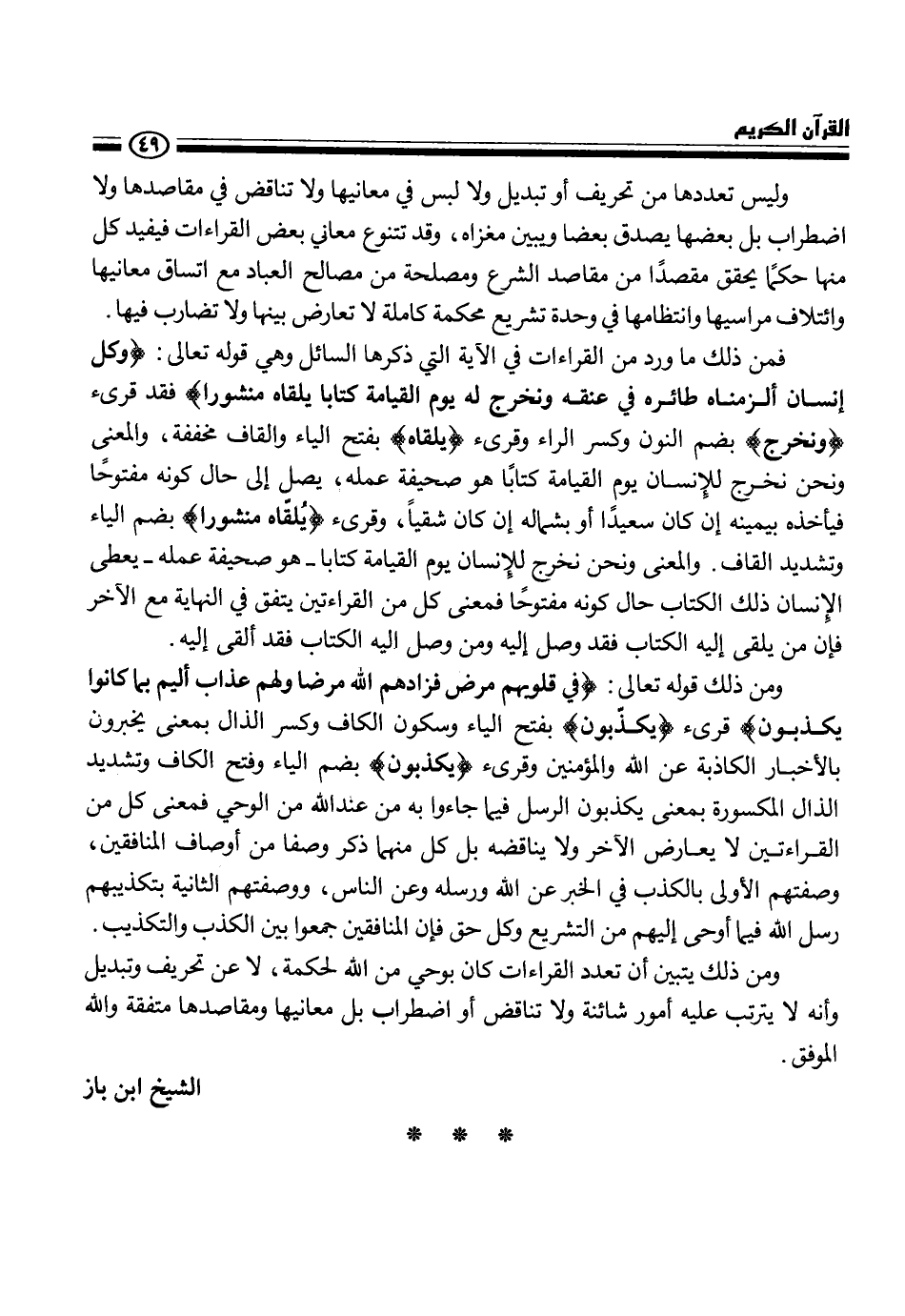 ومن ذلك قوله تعالى {في قلوبهم مرض فزادهم الله مرضا ولهم عذاب أليم بما كانوا يكذبون} قرئ {يكذبون} بفتح الياء وسكون الكاف وكسر الذال بمعنى يخبرون بالأخبار الكاذبة عن الله والمؤمنين وقرئ {يكذبون} بضم الياء وفتح الكاف وتشديد الذال المكسورة بمعنى يكذبون الرسل فيما جاءوا به من عند الله من الوحي فمعنى كل من القراءتين لا يعارض الآخر ولا يناقضه بل كل منها ذكر وصفا من أوصاف المنافقين، وصفتهم الأولى بالكذب في الخبر عن الله ورسله وعن الناس، ووصفتهم الثانية بتكذبيهم رسل الله فيما أوحى إليهم من التشريع وكل حق فإن المنافقين جمعوا بين الكذب والتكذيب. ومن ذكل يتبين أن تعدد القراءات كان بوحي من الله لحكمه، لا عن تحريف وتبديل وأنه لا يترتب عليه أمور شائنة ولا تناقض أو اضطراب بل معانيها ومقاصدها متفقة والله الموفق.