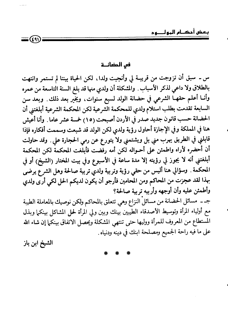 س - سبق أن تزوجت من قريبة لي وأنجبت ولداً، لكن الحياة بيننا لم تستمر وانتهت بالطلاق ولا داعي لذكر الأسباب، والمشكلة أن ولدي منها قد بلغ السنة التاسعة من عرمه وأنا أعلم حقها الشرعي في حضانة الولد لسبع سنوات، ويخبر بعد ذلك، وبعد سن السابعة تقدمت بطلب استلام ولدي للمحكمة الشرعية لكن المحكمة الشرعية أبلغتني أن الحضانة حسب قانون جديد صدر في الأردن أصبحت (15) خمسة عشر عاماً. وأنا أعيش هنا في المملكة وفي الإجازة أحاول رؤية ولدي لكن الولد قد شبعت وسممت أفكاره فإذا قابلني في الطريق يهرب مني بل ويشتمني ولا يتورع عن رمي الحجار علي. وقد حاولت أن أحضره لأراه وأطمئن على أحواله لكن أمه رفضت فأبلغت المحكمة لكن المحكمة أبلغتني أنه لا يجوز لي رؤيته إلا مدة ساعة في الأسبوع وفي بت المختار (الشيخ) أو في المحكمة. وسؤالي هنا أليس من حقي رؤية وتربية ولدي تربية صالحة وهل الشرع يرضى بهذا لقد عجزت من المحاكم ومن المحامين فأرجو أن يكون لديكم الحل لكي أرى ولدي وأطمئن عليه وأن أوجهه وأربيه تربية صالحة؟