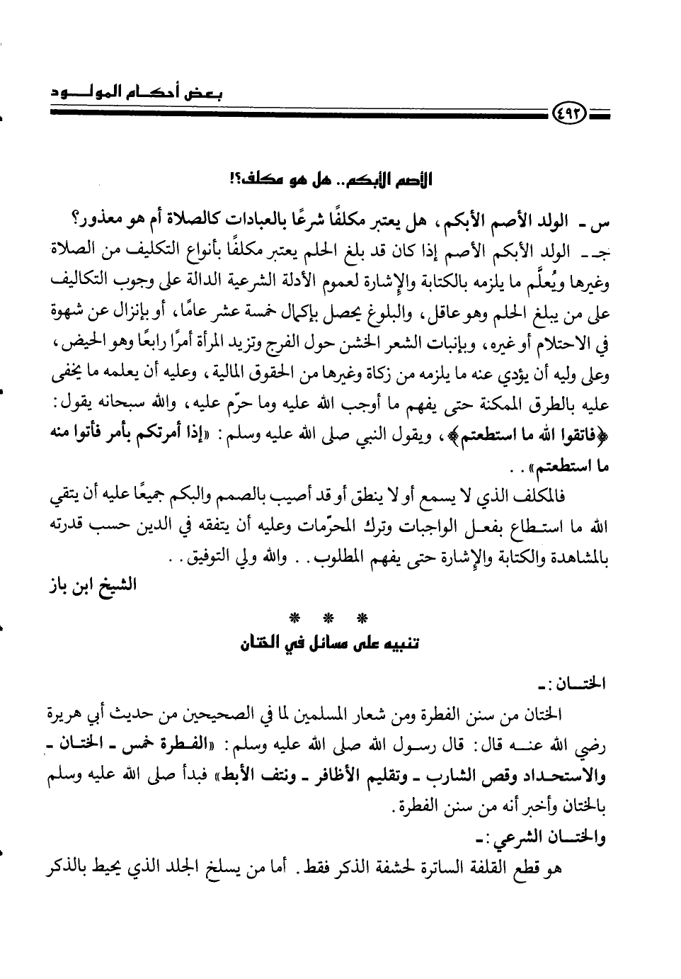 ج- الولد الأبكم الأصم إذا كان قد بلغ الحلم يعتبر مكلفاً بأنواع التكاليف من الصلاة وغيرها ويعلم ما يلزمه بالكتابة والإشارة لعموم الأدلة الشرعية الدالة على وجوب التكاليف على من يبلغ الحلم وهو عاقل، والبلوغ يحصل بإكمال خمسة عشر عاما، أو بإنزال عن شهوة فى الاحتلام أو غيره، وبإنبات الشعر الخشن حول الفرج وتزيد المرأة أمراً رابعاً وهو الحيض، وعلى وليه أن يؤدي عنه ما يلزمه من زكاة وغيرها من الحقوق المالية، وعليه أن يعلمه ما يخفى عليه بالطرق الممكنة حتى يفهم ما أوجب الله عليه وما حرم عليه، والله سبحانه وتعالى يقول {فاتقوا الله ما استطعتم} ، ويقول النبي، - صلى الله عليه وسلم -، {إذا أمرتكم بأمر فاتوا منه ما استطعتم} .