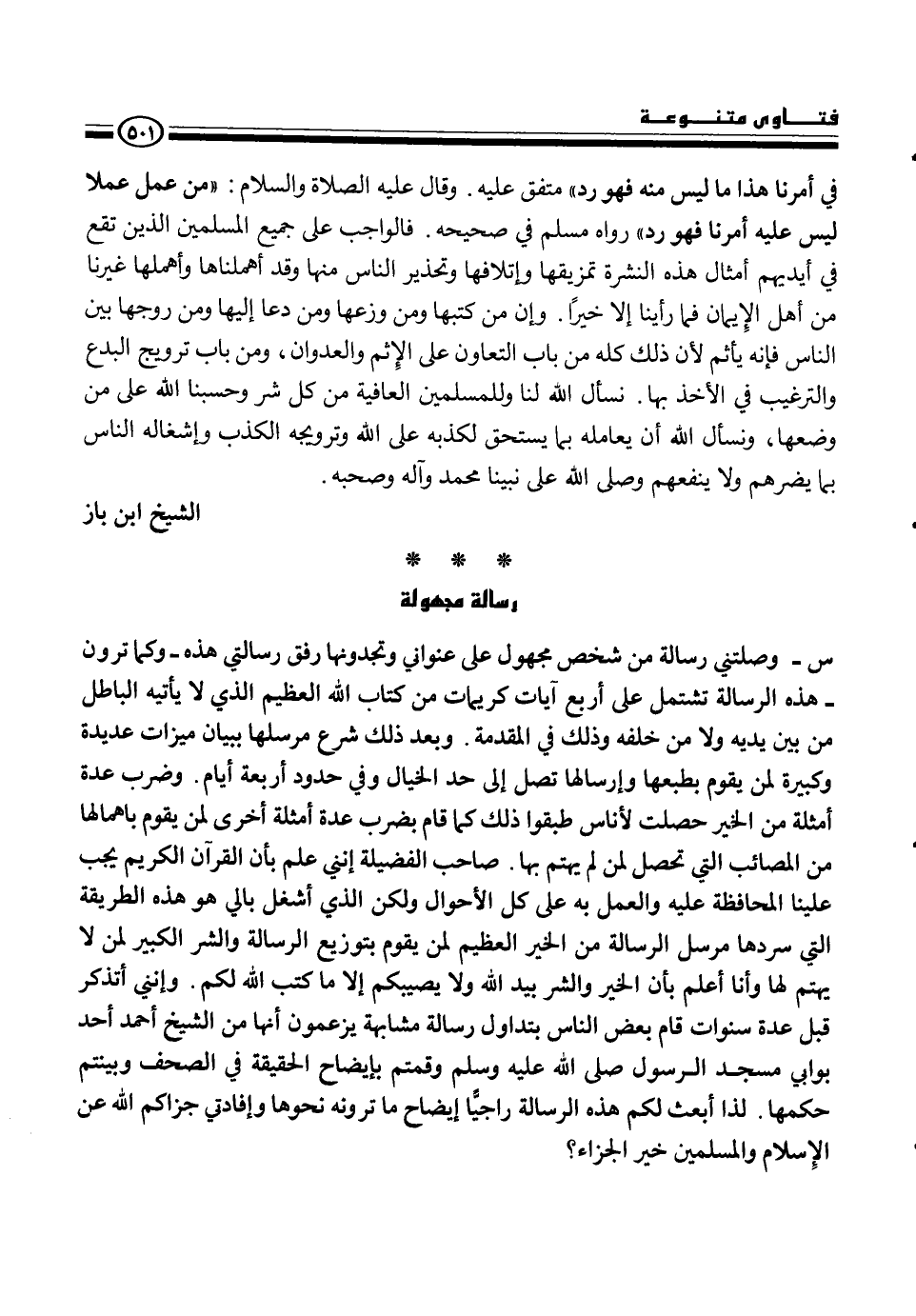 في أمرنا هذا ما ليس منه فهو رد} متفق عليه. وقال عليه الصلاة والسلام {من عمل عملا ليس عليه أمرنا فهو رد} رواه مسلم في صحيحه، فالوجب على جميع المسلمين الذين تقع في أيديهم أمثال هذه النشرة تمزيقها وإتلافها وتحذير الناس منها وقد أهملناها وأهلمها غيرنا من أهل الإيمان فما رأينا إلا خيراً. وإن من كتبها ومن وزعها ومن دعا إليها ومن زوجها بين الناس فإنه يأثم لأن ذلك كله من باب التعاون على الإثم والعدوان، ومن باب ترويج البدع والترغيب في الأخذ بها. نسأل الله لنا وللمسلمين العافية من كل شر وحسبنا الله على من وضعها، ونسأل الله أن يعامله بما يستحق لكذبه على الله وترويجه الكذب وإشغاله الناس بما يضرهم ولا ينفعهم وصلى اله على نبينا محمد وآله وصحبه.