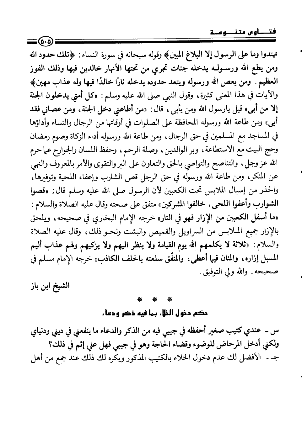 س - عندي كتيب صغيراً أحفظه في جيبي فيه من الذكر والدعاء ما ينفعني في ديني ودنياي ولكني أدخل المرحاض للوضوء وقضاء الحاجة وهو في جيبي فهل على إثم في ذلك؟
