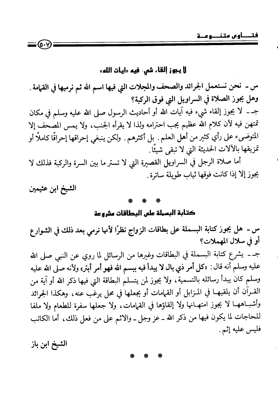 ج- يشرع كتابة البسملة في البطاقات وغيرها من الرسائل لما روي عن النبي، - صلى الله عليه وسلم -، أنه قال {كل أمر ذي بال لا يبدأ فيه ببسم الله فهو أمر أبتر} ولأنه صلى الله عليه وسلم كان يبدأ رسائله بالتسميه، ولا يجوز لمن يستلم البطاقة التي فيها ذكر الله أو آية من القرآن أن يلقيها في المزابل أو القمامات أو يجعلها في محل يرغب عنه، وهكذا الجرائد وأشباهها لا يجوز امتهانها ولا إلقاؤها في القمامات، ولا جعلها سفرة للطعام ولا ملفا للحاجات لما يكون فيها من ذكر الله - عز وجل - والإثم على من فعل ذلك، أما الكاتب فليس عليه إثم.