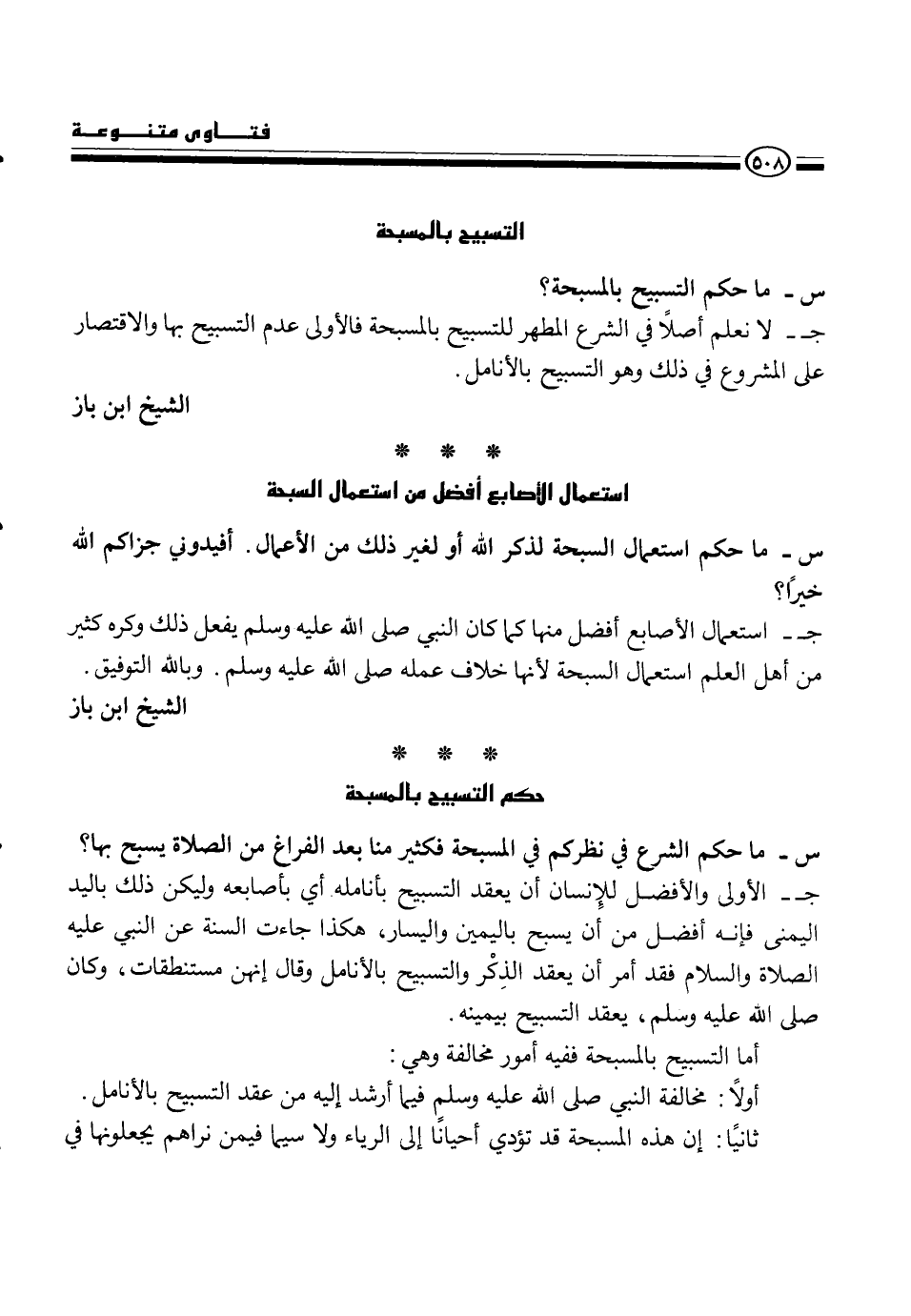ج- لا نعلم أصلاً في الشرع المطهر للتسبيح بالمسبحة فالأولى عدم التسبيح بها والاقتصار على المشروع في ذلك وهو التسبيح بالأنامل.