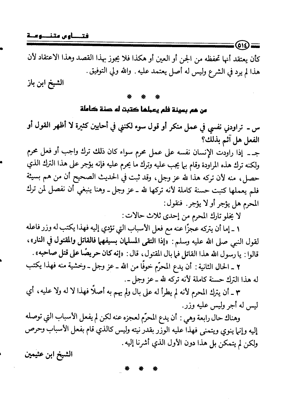 1- إما أن يتركه عجزاً عنه مع فعل الأسباب التي تؤدي إليه فهذا يكتب له وزر فاعله لقول النبي، - صلى الله عليه وسلم -، {إذا التقى المسلمان بسيفهما فالقاتل والمقتول في النار} ، قالوا يا رسول الله هذا القاتل فما بال المقتول، قال {إنه كان حريصا على قتل صاحبه} .