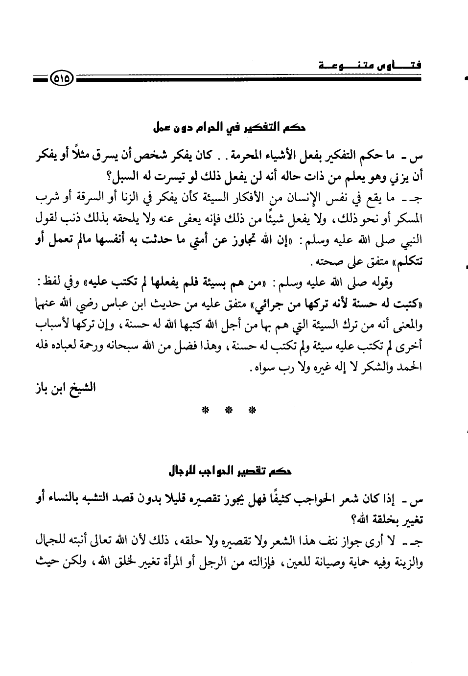 ج- ما يقع في نفس الإنسان من الأفكار السيئة كأن يفكر في الزنا أو السرقة أو شرب المسكر أو نحو ذلك، ولا يفعل شيئا من ذكل فإنه يعفى عنه ولا يلحقه بذلك ذنب لقول النبي، - صلى الله عليه وسلم -، {إن الله تجاوز عن أمتي ما حدثت به أنفسها ما لم تعمل أو تتكلم} متفق على صحته.
