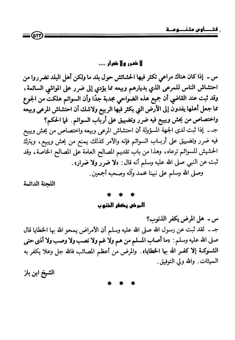 ج- إذا ثبت لدى الجهة المسؤولة أن احتشاش المرعى وبيعه واختصاص من يحش ويبيع فيه ضرر وتضييق على أرباب السوائم فإنه الأمر كذلك يمنع من يحش ويبيع، ويترك الحشيش للسوائم ترعاه، وهذا من باب تقديم المصالح العامة على المصالح الخاصة، وقد ثبت عن النبي، - صلى الله عليه وسلم -، أنه قال " لا ضرر ولا ضرار ".