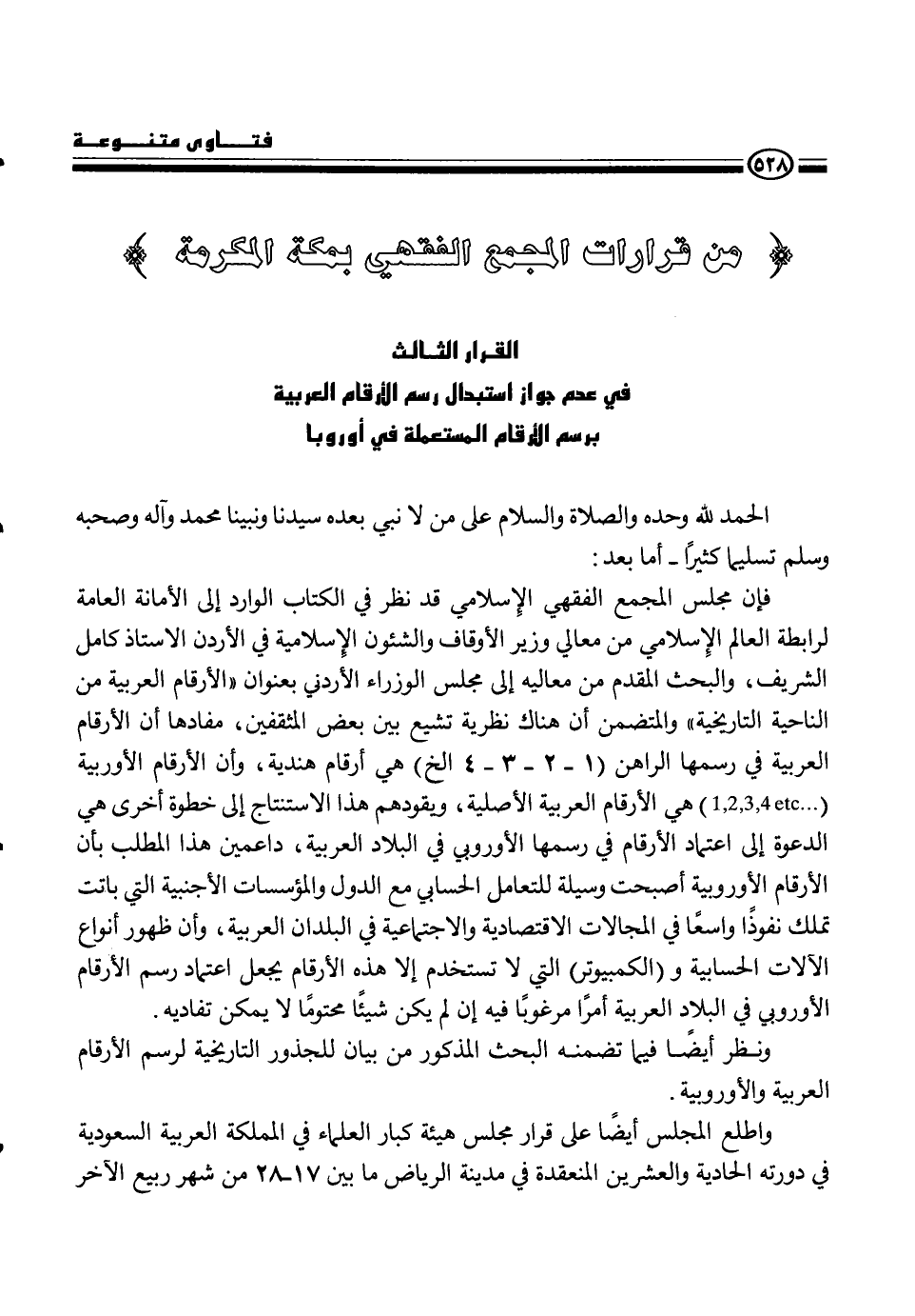 فإن مجلس المجمع الفقهي الإسلامي قد نظر في الكتاب الوارد إلى الأمانة العامة لرابطة العالم الإسلامي من معالي وزير الأوقاف والشؤون الإسلامية في الأردن الاستاذ كامل الشريف، والبحث المقدم من معاليه إلى مجلس الوزراء الأردني بعنوان " الأرقام العربية من الناحية التاريخية " والمتضمن أن هناك تشيع بين بعض المثقفين، مفادها أن الأرقام العربية في رسمها الراهن (1، 2، 3، 4 الخ) هي أرقام هندية، وأن الأرقام الأوربية (1 , 2 , 3 , 4 etc) هي الأرقام العربية الأصلية، ويقودهم هذا الاستنتاج إلى خطوة أخرى هي الدعوة إلى اعتماد الأرقام في رسمها الأوروبي في البلاد العربية، داعمين هذا المطلب بأن الأرقام الأوروبية أصبحت وسيلة للتعامل الحسابي مع الدول والمؤسسات الأجنبية التي باتت تملك نفوذاً واسعاً في المجالات الاقتصادية والاجتماعية في البلدان العربية، وأن ظهور أنواع الآلات الحسابية والكمبيوتر التي لا تستخدم إلا هذه الأرقام يجعل اعتماد رسم الأرقام الأوروبي في البلاد العربية أمراً مرغوباً فيه إن لم يكن شيئاً محتوماً لا يمكن تفاديه.