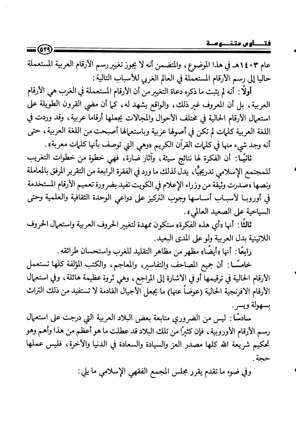 عام 1403هـ في هذا الموضوع، والمتضمن أنه لا يجوز تغيير رسم الأرقام العربية المستعلمة حالياً إلى رسم الأرقام المستعملة في العالم الغربي للأسباب التالية