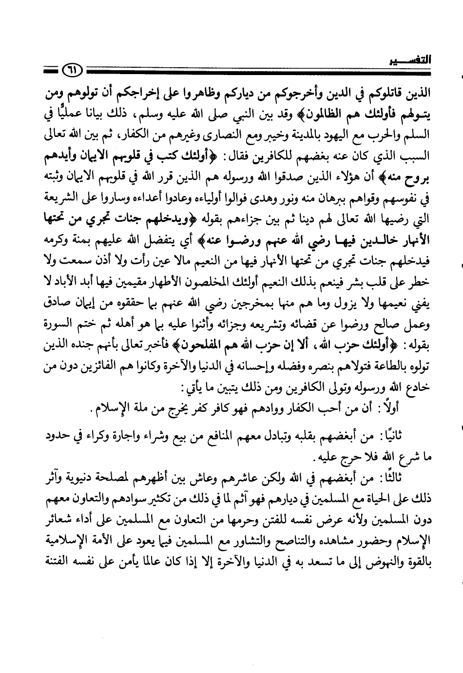 الذين قاتلوكم في الدين وأخرجوكم من دياركم وظاهروا على إخراكم أن تولوهم ومن يتولهم فأولئك هم الظالمون} وقد بين النبي، - صلى الله عليه وسلم -، ذلك بياناً عملياً في السلم والحرب مع اليهود بالمدينة وخيبر ومع النصارى وغيرهم من الكفار، ثم بين الله تعالى السبب الذي كان عنه بغضهم للكافرين فقال {أولئك كتب في قلوبهم الايمان وأيدهم بروح منه} أن هؤلاء الذين صدقوا الله ورسوله هم الذين قرر الله في قلوبهم الايمان وثبته في نفوسهم وقواهم ببرهان منه ونور وهدى فوالوا أولياء وعادوا أعداءه وساروا على الشريعة التي رضيها الله تعالى لهم دينا ثم بين جزاءهم بقوله {ويدخلهم جنات تجري من تحتها الأنهار خالدين فيها رضي الله عنهم ورضوا عنه} أي يتفضل الله عليهم بمنة وكرمه فيدخلهم جنات تجري من تحتها الأنهار فيها من النعيم ما لا عين رأت ولا أذن سمعت ولا خطر على قلب بشر فيمنعهم بذلك النعيم أولئك المخلصون الأطهار مقيمين فيها أبد الأباد لا يفنى نعيمها ولا يزول وما هم منها بمخرجين رضي الله عنهم بما حققوه من إيمان صادق وعمل صالح ورضوا عن قضائه وتشريعه وجزامئه وأثنوا عليه بما هو أهله ثم ختم السورة بقوله {أولئك حزب الله، ألا إن حزب الله هو المفلحون} فأخبر تعالى بأنهم جنده الذين تولوه بالطاعة فتولاهم بنصره وفضله وإحسانه في الدنيا والآخره وكانوا هم الفائزين دون من خادع الله ورسوله وتولى الكافرين ومن ذلك يتبين ما يأتي