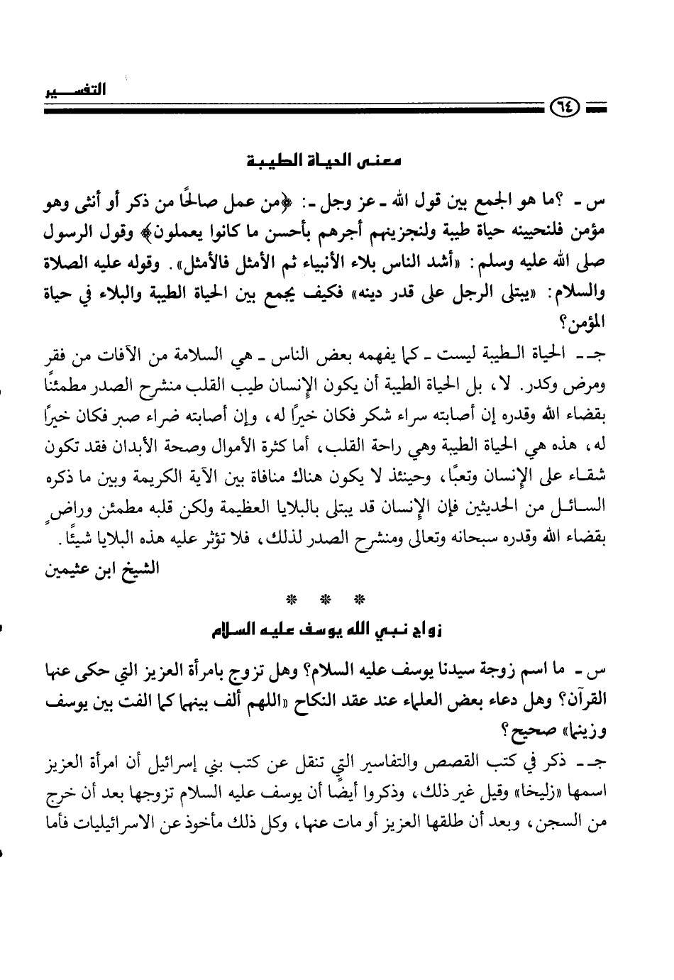 س - ما هو الجمع بين قول الله - عز وجل - {من عمل صالحاً من ذكر أو أنثى وهو مؤمن فلنحيينه حياة طيبة ولنجزينهم أجرهم بأحسن ما كانوا يعملون} وقول الرسول، - صلى الله عليه وسلم -، {أشد الناس بلاء الأنبياء ثم الأمثل فالأمثل} . وقوله عليه الصلاة والسلام {يبتلى الرجل على قدر دينه} فكيف يجمع بين الحياة الطيبة والبلاء في حياة المؤمن؟