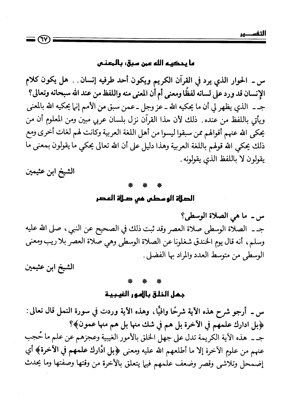 ج- الذي يظهر لي أن ما يحكيه الله - عز وجل - عمن سبق من الأمم إنما يحكيه الله بالمعنى ويأتي باللفظ من عنده. ذلك لأن هذا القرآن نزل بلسان عربي مبين ومن المعلوم أن من يحكى الله عنهم أقوالهم ممن سبقوا ليسوا من أهل اللغة العربية وكانت لهم لغات أخرى ومع ذلك يحكى الله قولهم باللغة العربية وهذا دليل على أن الله تعالى يحكي ما يقولون بمعنى ما يقولون لا باللفظ الذي يقولونه.
