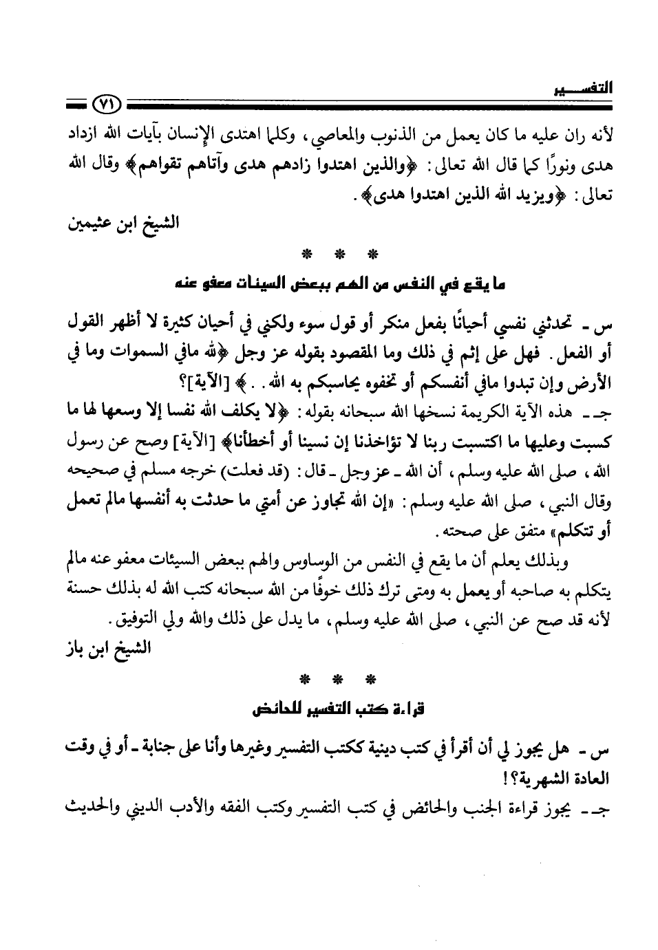 س - هل يجوز لي أن أقرأ في كتب دينية ككتب التفسير وغيرها وأنا على جنابة - أو في وقت العادة الشهرية؟