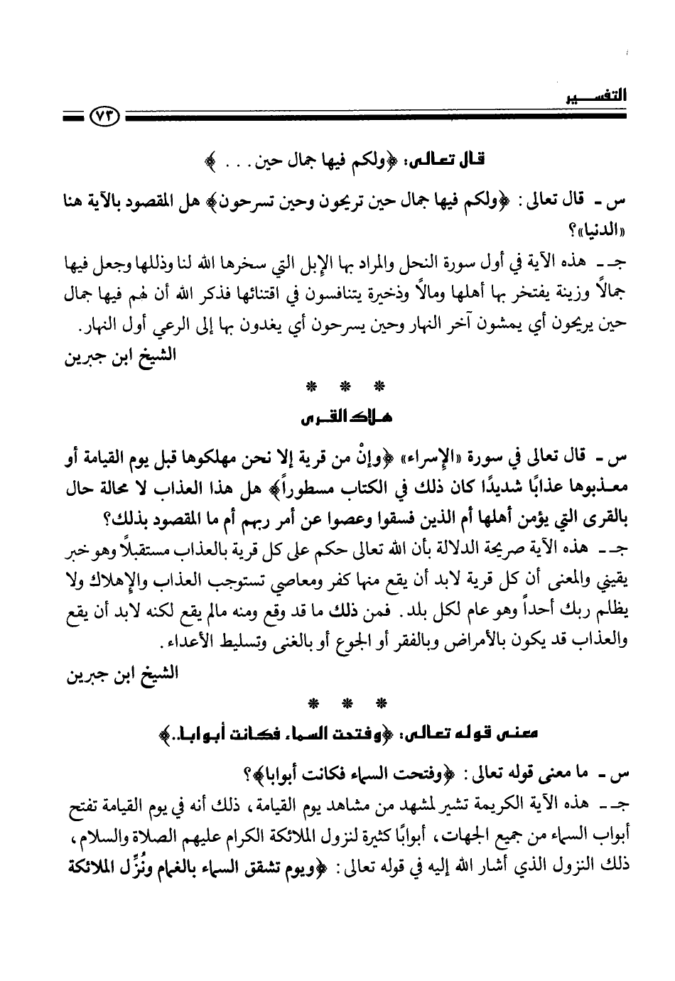 ج- هذه الآية في أول سورة النحل والمراد بها الإبل التي سخرها الله لنا وذللها وجعل فيها جمالاً وزينة يفتخر بها أهلها ومالاً وذخيرة يتنافسون في اقتنائها فذكر الله أن لهم فيها جمال حين يريحون أي يمشون آخر النهار وحين النهار وحين يسرحون أي يغذون بها إلى الرعي أو النهار.