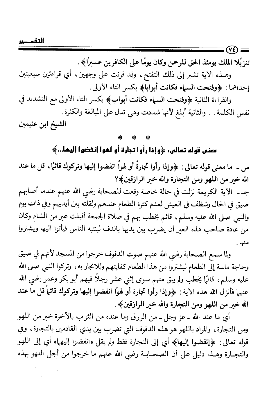 ج- الآية الكريمة نزلت في حالة خاصة وقعت للصحابة رضي الله عنهم عندما أصابهم ضيق في الحال وشطف في العيش لعدم كثرة الطعام عندهم ولقلته بين أيديهم وفي ذات يوم والنبي، - صلى الله عليه وسلم -، قائم يخطب بهم في صلاة الجمعة أقبلت عير من الشام وكان من عادة صاحب هذه العير أن يضرب بين يديها بالدف لينتبه الناس فيأتوا إليها ويشتروا منها.