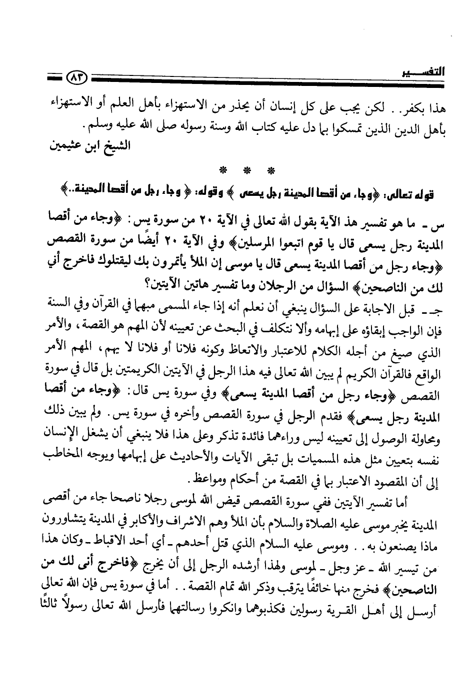 ج- قبل الإجابة على السؤال ينبغي أن نعلم أنه إذا جاء المسمى مبهما في القرآن وفي السنة فإن الواجب إبقاؤه على إبهامه وألا تتكلف في البحث عن تعيينه لأن المهم هو القصة، والأمر الذي صيغ من أجله الكلام للاعتبار والاتعاظ وكونه فلانا أو فلانا لا يهم، المهم الأمر الذي صيغ من أجله الكلام للاعتبار والاتعاظ وكونه فلانا أو فلانا لا يهم، المهم الأمر الواقع فالقرآن الكريم لم يبين الله تعالى فيه هذا الرجل في الآيتين الكريمتين بل قال في سورة القصص {وجاء رجل من أقصا المدينة يسعى} وفي سورة يس قال {وجاء من أقصا المدينة رجل يسعى} فقدم الرجل في سورة القصص وآخره في سورة يس. ولم يبين ذلك ومحاولة الوصول إلى تعيينه ليس وراءهما فائدة تذكر وعلى هذا فلا ينبغي أن يشغل الإنسان نفسه بتعين مثل هذه المسميات بل تبقى الآيات والأحاديث على إبهامها ويوجه المخاطب إلى أن المقصود الاعتبار بما في القصة من أحكام ومواعظ.