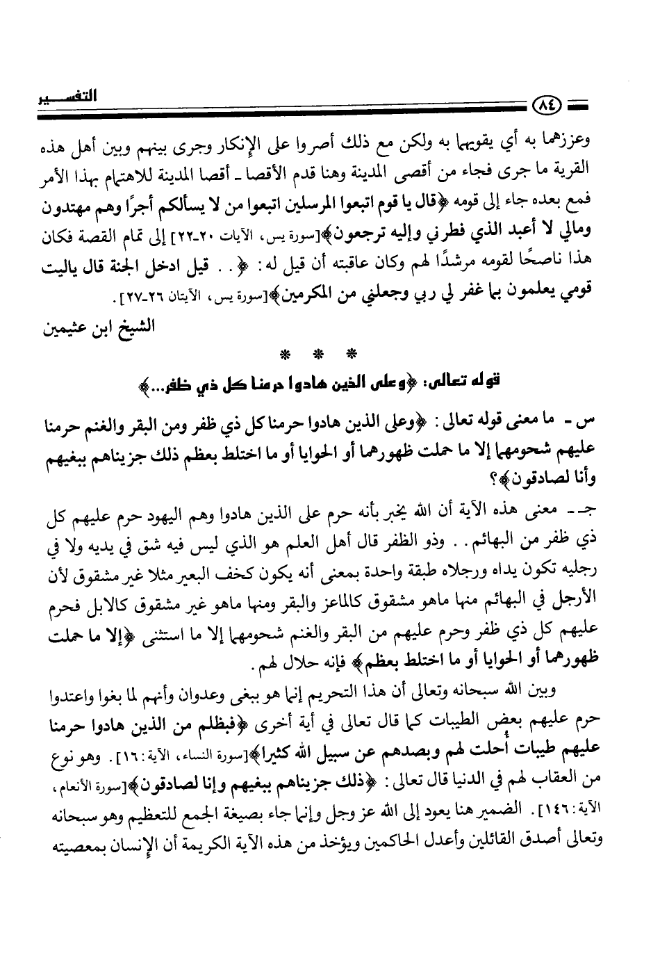 ج- معنى هذه الآية أن الله يخبر بأنه حرم على الذين هادوا وهم اليهود حرم عليهم كل ذي ظفر من البهائم.. وذو الظفر قال أهل العلم هو الذي ليس فيه شق في يديه ولا في رجليه تكون يداه ورجلاه طبقة واحدة بمعنى أن يكون كخف البعير مثلا غير مشقوق لأن الأرجل في البهائم منها ما هو مشقوق كالماعز والغنم شحومهما إلا ما استثنى {إلا ما حملت ظهورهما أو الحوايا أو ما اختلط بعظم} فإنه حلال لهم.