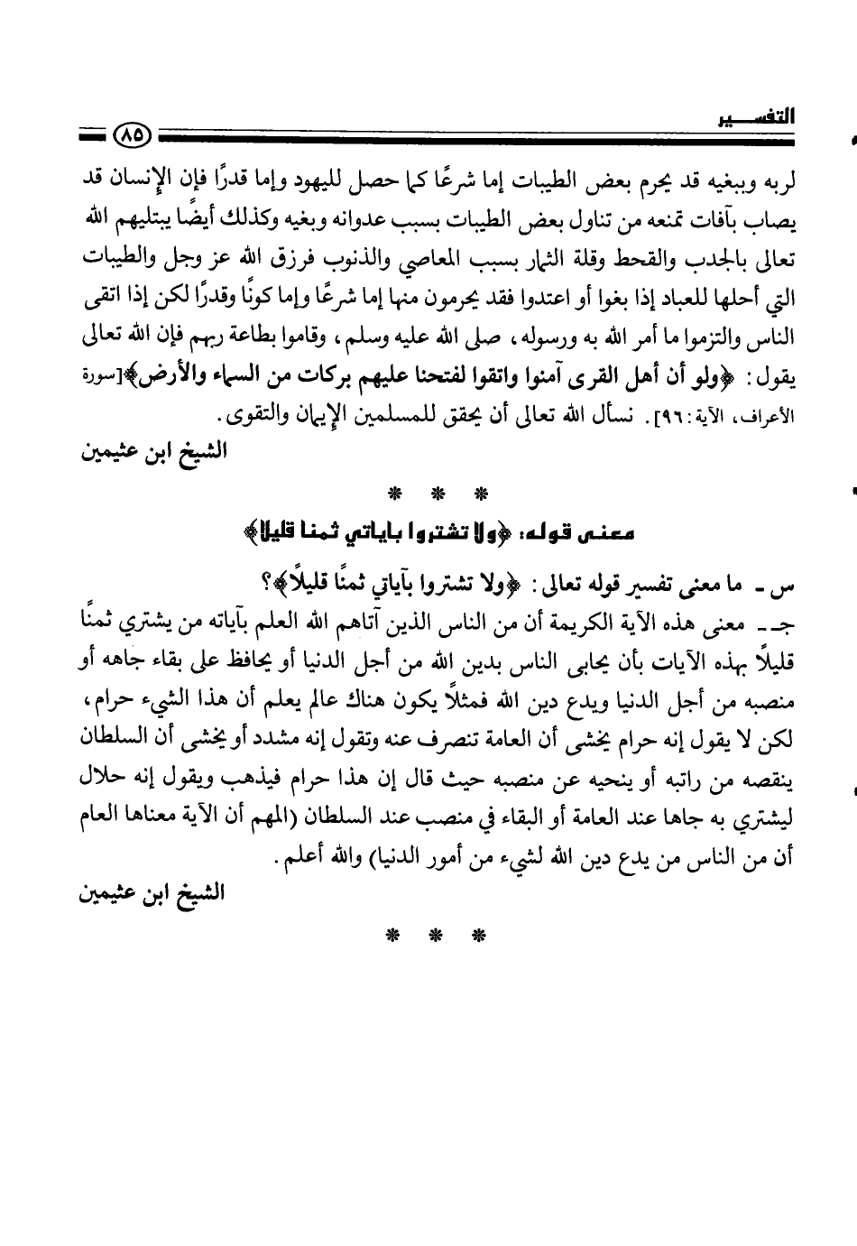 س - ما معنى تفسير قوله تعالى {ولا تشتروا بآياتي ثمنا قليلاً} ؟