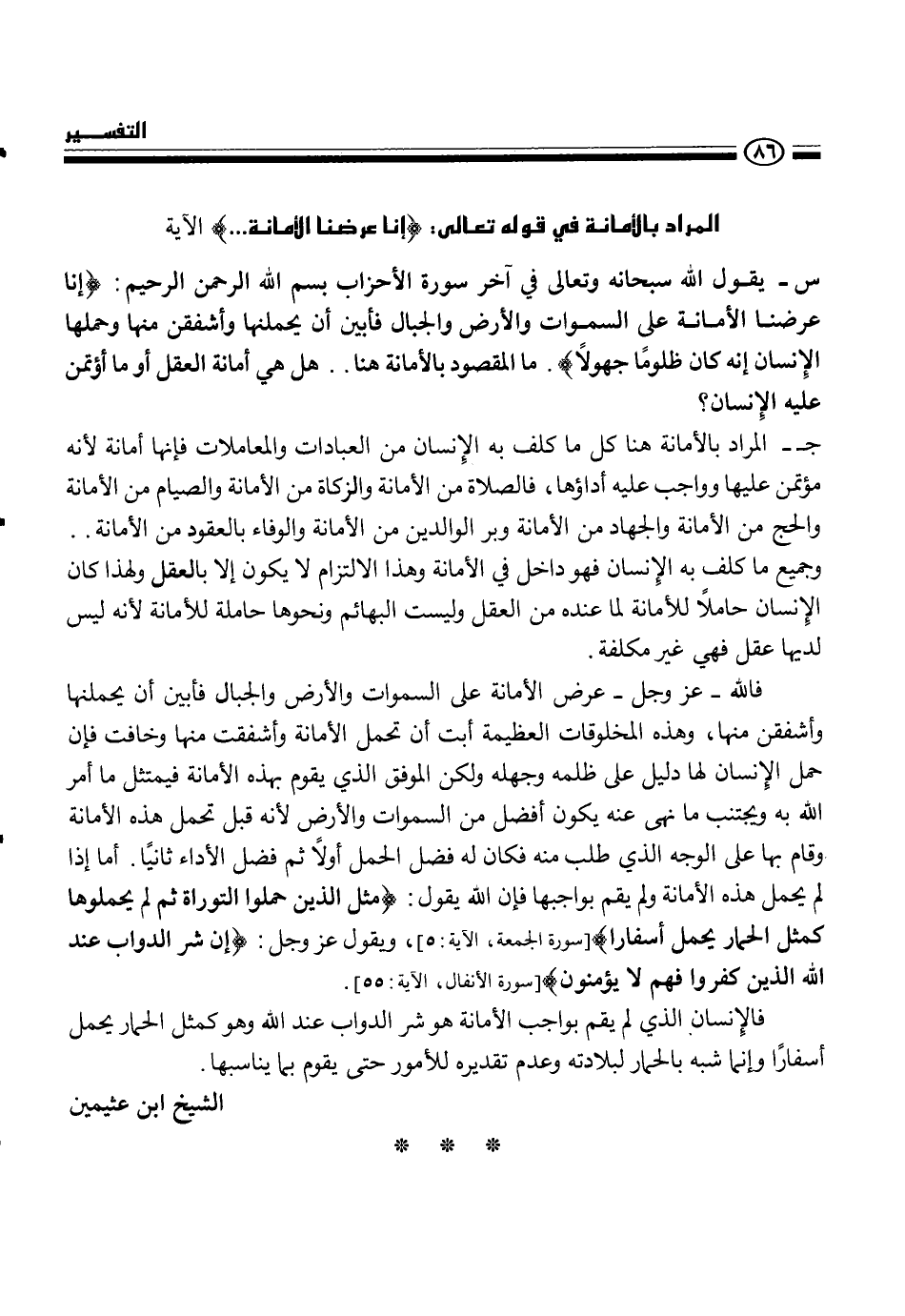 ج- المراد بالأمانة هنا كل ما كلف به الإنسان من العبادات والمعاملات فإنها أمانة لأنه مؤتمن عليها وواجب عليه أداؤها، فالصلاة من الأمانة والزكاة من الأمانة والصيام من الأمانة والحج من الأمانة والجهاد من الأمانة وبر الوالدين من الأمانة والوفاء بالعقود من الأمانة.. وجميع ما كلف به الإنسان فهو داخل في الأمانة وهذا الالتزام لا يكون إلا بالعقل ولهذا كان الإنسان حاملاً للأمانة لما عنده من العقل وليست البهائم ونحوها حاملة للأمانة لأنه ليس لديها عقل فهي غير مكلفة.