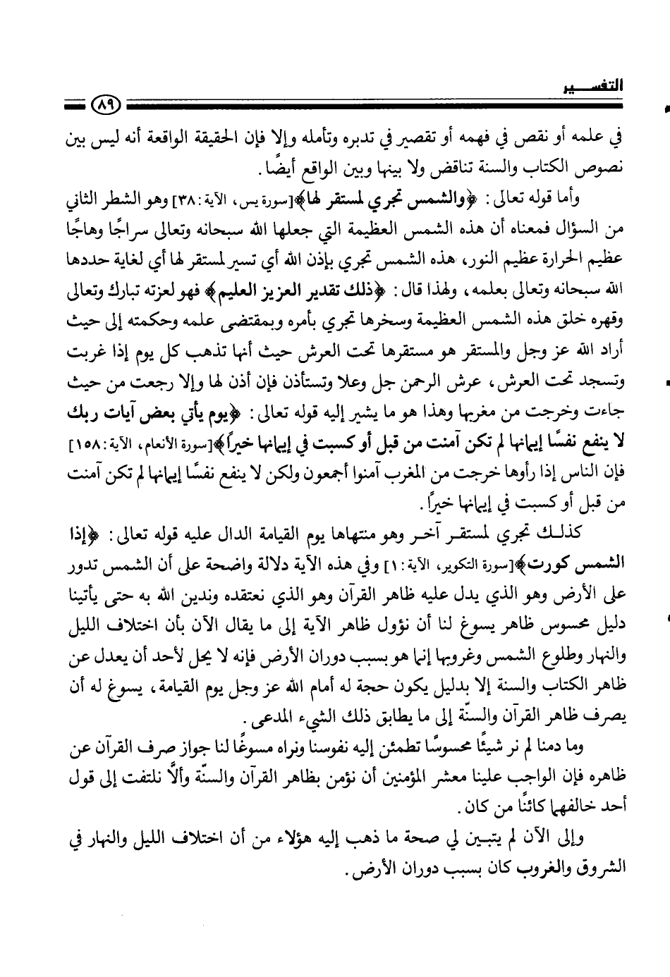 كذلك تجري لمستقر آخر وهو منتهاها يوم القيامة الدال عليه قوله تعالى {إذا الشمس كروت} سورة التكوير، الآية 1 وفي هذه الآية دلالة واضحة على أن الشمس تدور على الأرض وهو الذي يدل عليه ظاهر القرآن وهو الذي نعتقده وندين الله به حتى يأتينا دليل محسوس ظاهر يسوغ لنا أن نؤول ظاهر الآية إلى ما يقال الآن بأن اختلاف الليل والنهار وطلوع الشمس وغروبها إنما هو بسبب دوران الأرض فإنه لا يحل لأحد أن يعدل عن ظاهر الكتاب والسنة إلا بدليل يكون حجة له أمام الله عز وجل يوم القيامة، يسوغ له أن يصرف ظاهر القرآن والسنة إلى ما يطابق ذلك الشيء المدعى.