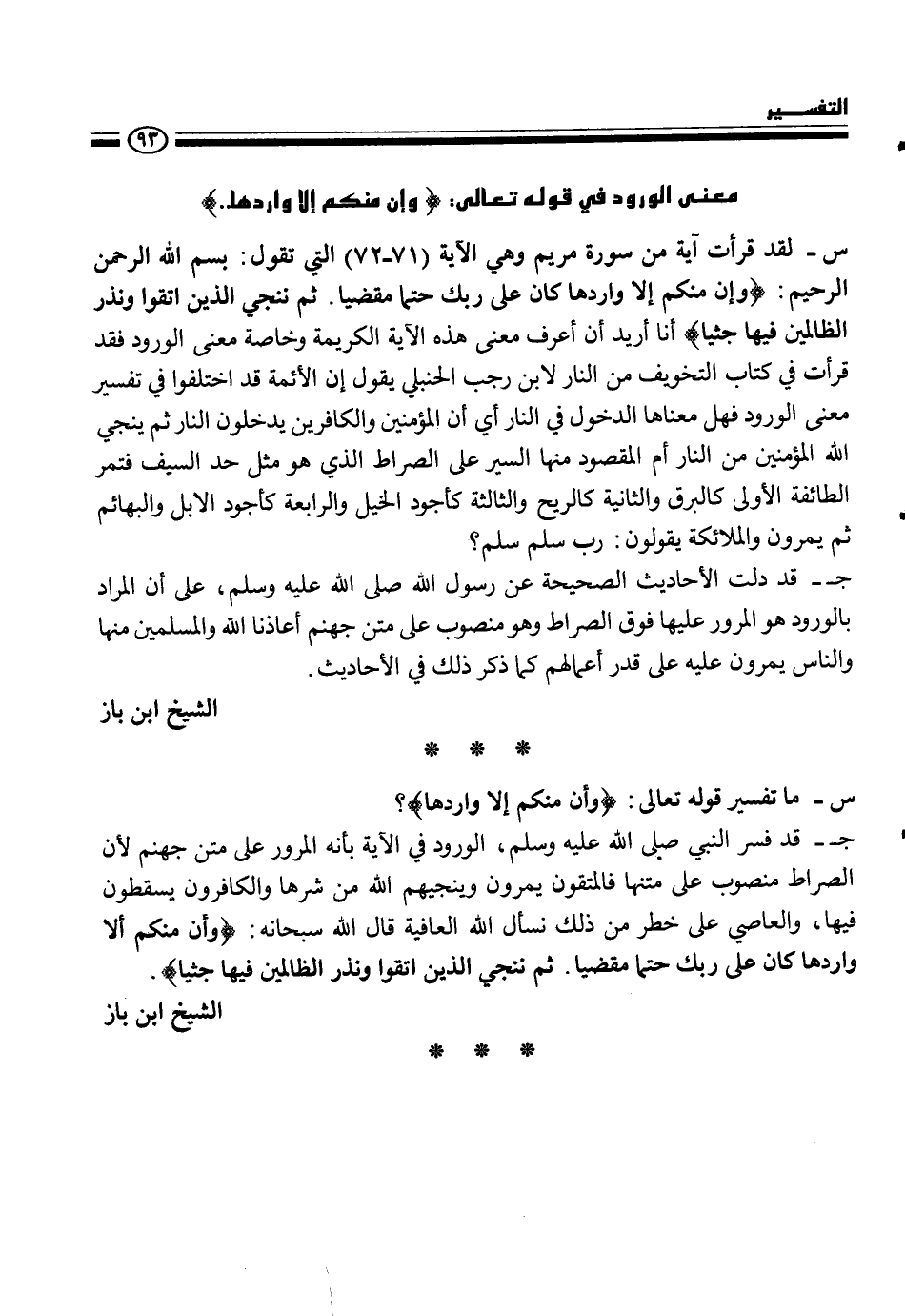 س - لقد قرآن آية من سورة مريم وهي الآية (71-72) التي تقول بسم الله الرحمن الرحيم {وإن منكم إلا واردها كان على ربك حتما مقضيا. ثم ننجي الذين اتقوا ونذر الظالمين فيها جثيا} أنا أريد أن أعرف معنى هذه الآية الكريمة وخاصة معنى الورود فقد قرأت في كتاب التخويف من النار لابن رجب الحنبلي يقول إن الأئمة قد اختلفوا في تفسير معنى الورود فهل معناها الدخول في النار أي أن المؤمنين والكافرين يدخلون النار ثم ينجي الله المؤمنين من النار أم المقصود منها السير على الصراط الذ هو حد السيف فتمر الطائفة الأولى كالبرق والثانية كالريح والثالثة كأجود الخيل الرابعة كأجود الابل والبهائم ثم يمرون والملائكة يقولون - رب سلم سلم؟