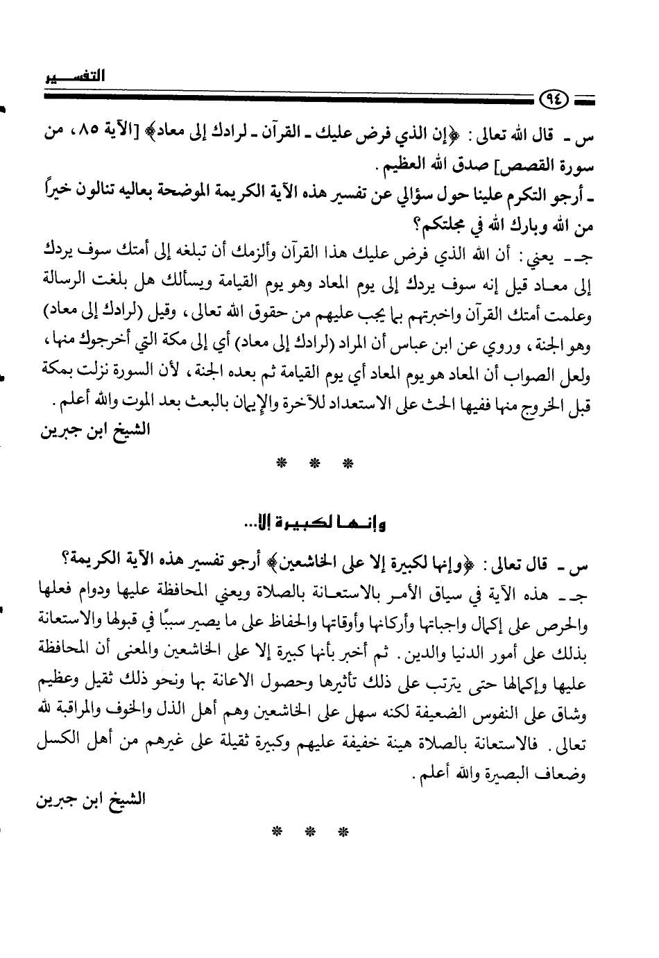 ج- هذه الآية في سياق الأمر بالاستعانة بالصلاة ويعني المحافظة عليها ودوام فعلها والحرص على إكمال واجباتها وأركانها وأوقاتها والحفاظ على ما يصير سبباً في قبولها والاستعانة بذلك على أمور الدنيا والدين. ثم أخبر بأنها كبيرة إلا على الخاشعين والمعنى أن المحافظة عليها وإكمالها حتى يترتب على ذلك تأثيرها وحصول الاعانة بها ونحو ذلك ثقيل وعظيم وشاق على النفوس الضعيفة لكنه سهل على الخاشعين وهم أهل الذل والخوف والمراقبة لله تعالى. فالاستعانة بالصلاة هينة خفيفة عليهم وكبيرة ثقيلة على غيرهم من أهل الكسل وضعاف البصيرة والله أعلم.