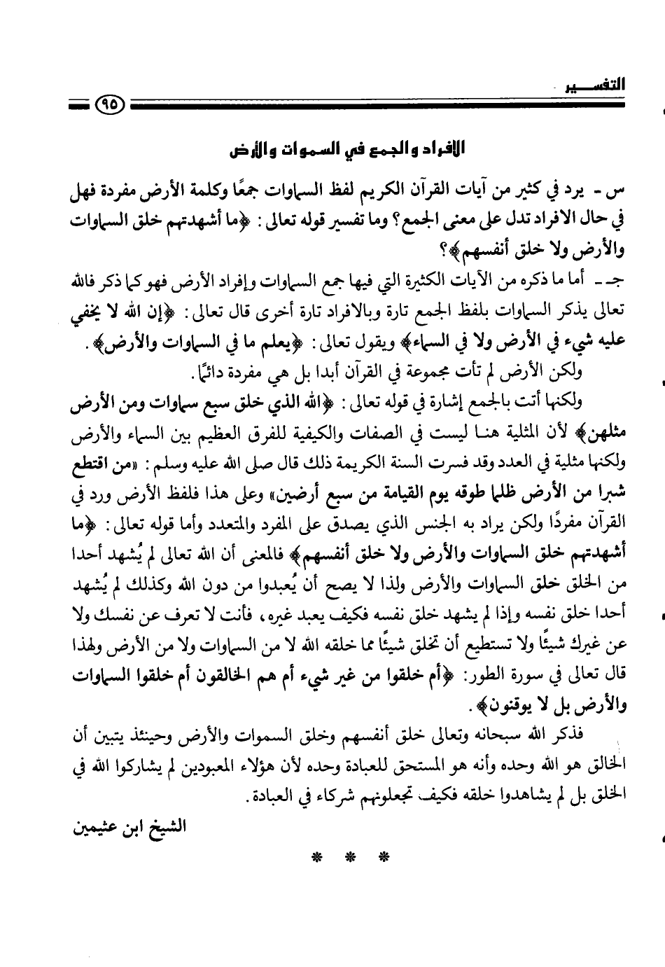 ج- أما ما ذكره من الآيات الكثيرة التي فيها جمع السماوات وإفراد الأرض فهو كما ذكر الله تعالى بذكر السموات بلفظ الجمع تارة وبالأفراد تارة أخرى قال تعالى {إن الله لا يخفي عليه شيء في الأرض ولا في السماء} ويقول تعالى {يعلم ما في السماوات والأرض} . ولكن الأرض لم تأت مجموعة في القرآن أبداً بل هي مفردة دائماً.