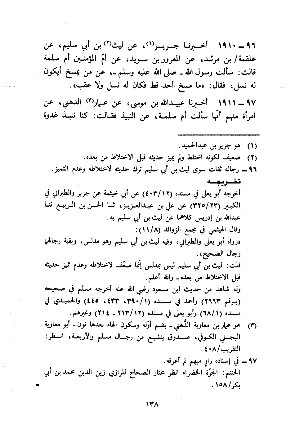 1910 - أَخْبَرَنَا جَرِيرٌ، عَنْ لَيْثِ بْنِ أَبِي سُلَيْمٍ، عَنْ عَلْقَمَةَ بْنِ مَرْثَدٍ، عَنِ الْمَعْرُورِ بْنِ سُوَيْدٍ، عَنْ أُمِّ الْمُؤْمِنِينَ أُمِّ سَلَمَةَ قَالَتْ: " سَأَلْتُ رَسُولَ اللَّهِ صَلَّى اللهُ عَلَيْهِ وَسَلَّمَ عَنْ مَنِ يُمْسَخُ أَيَكُونُ لَهُ نَسْلٌ، فَقَالَ: «§مَا مُسِخَ أَحَدٌ قَطُّ، فَكَانَ لَهُ نَسْلٌ وَلَا عَقِبٌ»