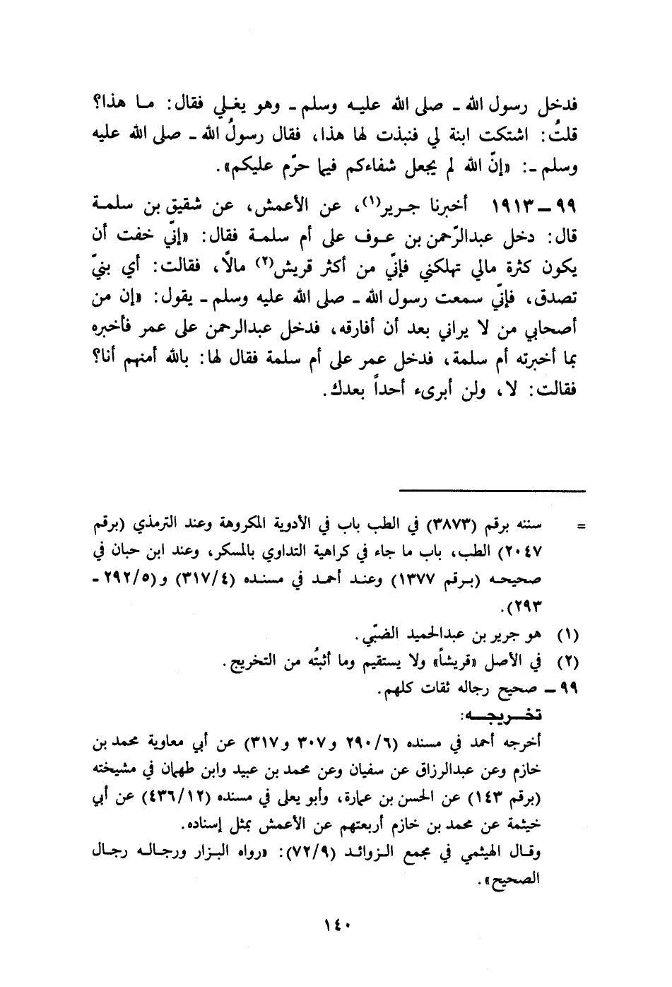 1913 - أَخْبَرَنَا جَرِيرٌ، عَنِ الْأَعْمَشِ، عَنْ شَقِيقِ بْنِ سَلَمَةَ، قَالَ: دَخَلَ عَبْدُ الرَّحْمَنِ بْنُ عَوْفٍ عَلَى أُمِّ سَلَمَةَ فَقَالَ: إِنِّي خِفْتُ أَنْ يَكُونَ كَثْرَةُ مَالِي تُهْلِكُنِي، فَإِنِّي مِنْ أَكْثَرِ قُرَيْشٍ مَالًا، فَقَالَتْ: أَيْ بُنَيَّ، تَصَدَّقْ؛ فَإِنِّي سَمِعْتُ رَسُولَ اللَّهِ صَلَّى اللهُ عَلَيْهِ وَسَلَّمَ يَقُولُ: «إِنَّ §مِنْ أَصْحَابِي مَنْ لَا يَرَانِي بَعْدَ أَنْ أُفَارِقَهُ» فَدَخَلَ عَبْدُ الرَّحْمَنِ عَلَى عُمَرَ فَأَخْبَرَهُ بِمَا أَخْبَرَتْهُ أُمُّ سَلَمَةَ، فَدَخَلَ عُمَرُ عَلَى أُمِّ سَلَمَةَ فَقَالَ لَهَا: بِاللَّهِ أَمِنْهُمْ أَنَا؟ فَقَالَتْ: لَا، وَلَنْ أُبْرِئَ أَحَدًا بَعْدَكَ "