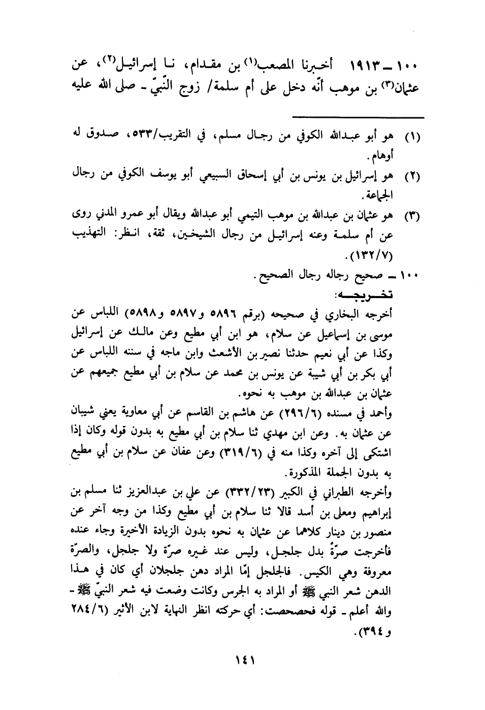 أَخْبَرَنَا الْمُصْعَبُ بْنُ مِقْدَامٍ، نا إِسْرَائِيلُ، عَنْ عُثْمَانَ بْنِ مَوْهَبٍ: أَنَّهُ «دَخَلَ عَلَى أُمِّ سَلَمَةَ زَوْجِ النَّبِيِّ صَلَّى اللهُ عَلَيْهِ وَسَلَّمَ §فَأَخْرَجَتْ لَهُ جُلْجُلًا -[142]- فِيهِ مِنْ شَعْرِ النَّبِيِّ صَلَّى اللهُ عَلَيْهِ وَسَلَّمَ، فَإِذَا هُوَ قَدْ صُبِغَ أَحْمَرَ، وَكَانَ إِذَا اشْتَكَى أَحَدٌ وَأَصَابَتْهُ عَيْنٌ جَاءَ بِإِنَاءٍ فَحَصْحَصَتْ لَهُ فَشَرِبَ مِنْهُ»