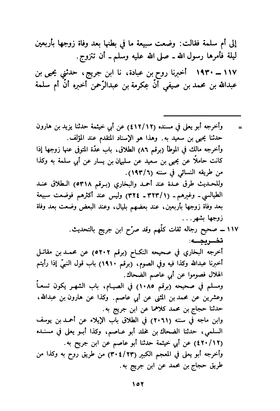1930 - أَخْبَرَنَا رَوْحُ بْنُ عُبَادَةَ، نا ابْنُ جُرَيْجٍ، حَدَّثَنِي يَحْيَى بْنُ عَبْدِ اللَّهِ بْنِ مُحَمَّدِ بْنِ صَيْفِيٍّ، أَنَّ عِكْرِمَةَ بْنَ عَبْدِ الرَّحْمَنِ أَخْبَرَهُ أَنَّ أُمَّ سَلَمَةَ -[153]- أَخْبَرَتْهُ: أَنَّ رَسُولَ اللَّهِ صَلَّى اللهُ عَلَيْهِ وَسَلَّمَ §حَلَفَ أَنْ لَا يَدْخُلَ عَلَى بَعْضِ أَهْلِهِ شَهْرًا، فَلَمَّا مَضَى تِسْعٌ وَعِشْرُونَ لَيْلَةً غَدَا عَلَيْهَا، أَوْ رَاحَ فَقِيلَ: يَا رَسُولَ اللَّهِ إِنَّكَ حَلَفْتَ عَلَى شَهْرٍ وَمَضَى تِسْعٌ وَعِشْرُونَ فَقَالَ: «الشَّهْرُ تِسْعٌ وَعِشْرُونَ»