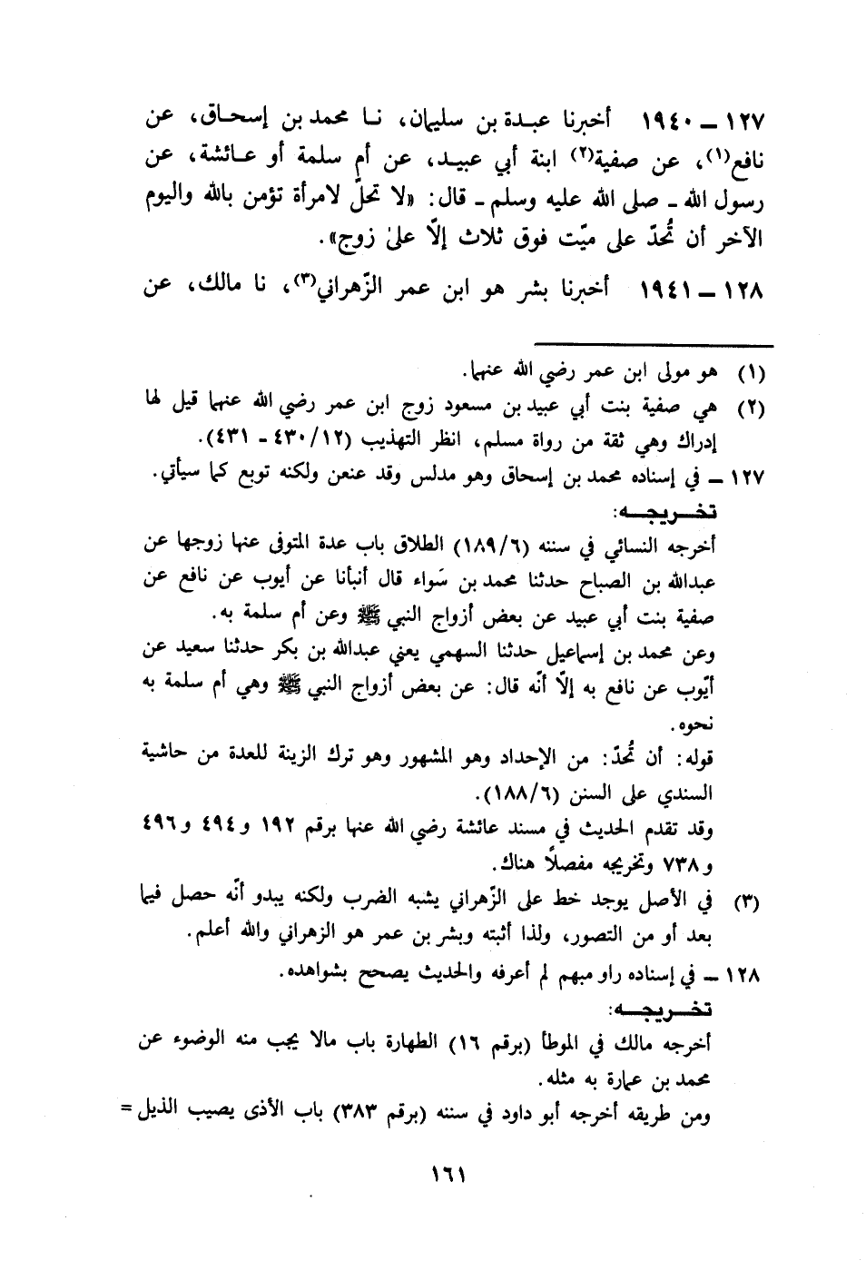 1940 - أَخْبَرَنَا عَبْدَةُ بْنُ سُلَيْمَانَ، نا مُحَمَّدُ بْنُ إِسْحَاقَ، عَنْ نَافِعٍ، عَنْ صَفِيَّةَ ابْنَةِ أَبِي عُبَيْدٍ، عَنْ أُمِّ سَلَمَةَ أَوْ عَائِشَةَ عَنْ رَسُولِ اللَّهِ صَلَّى اللهُ عَلَيْهِ وَسَلَّمَ قَالَ: «§لَا تَحِلُّ لِامْرَأَةٍ تُؤْمِنُ بِاللَّهِ وَالْيَوْمِ الْآخِرِ أَنْ تُحِدَّ عَلَى مَيِّتٍ فَوْقَ ثَلَاثٍ إِلَّا عَلَى زَوْجٍ»