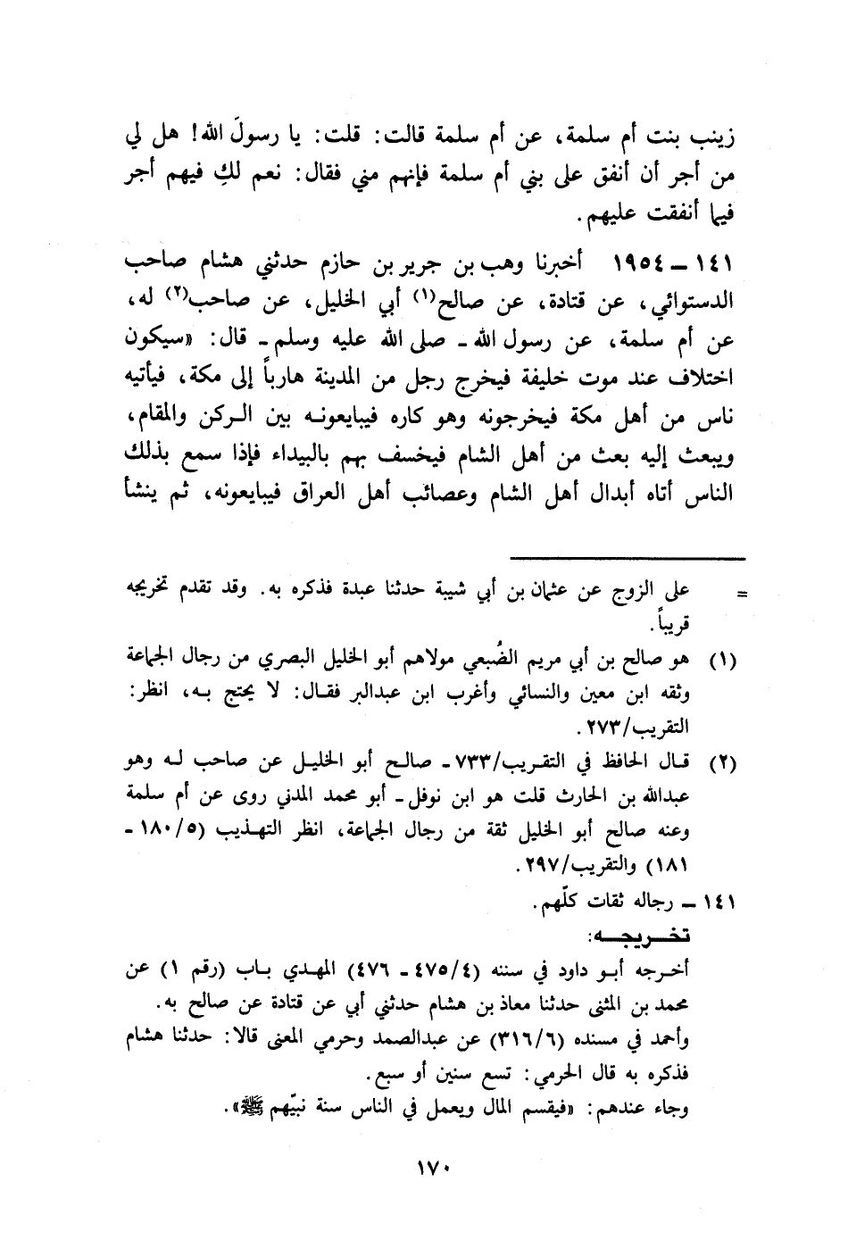 1954 - أَخْبَرَنَا وَهْبُ بْنُ جَرِيرِ بْنِ حَازِمٍ، حَدَّثَنِي هِشَامٌ صَاحِبُ الدَّسْتُوَائِيِّ، عَنْ قَتَادَةَ، عَنْ صَالِحِ أَبِي الْخَلِيلِ، عَنْ صَاحِبٍ لَهُ، عَنْ أُمِّ سَلَمَةَ عَنْ رَسُولِ اللَّهِ صَلَّى اللهُ عَلَيْهِ وَسَلَّمَ قَالَ: «§سَيَكُونُ اخْتِلَافٌ عِنْدَ مَوْتِ خَلِيفَةٍ، فَيَخْرُجُ رَجُلٌ مِنَ الْمَدِينَةِ هَارِبًا إِلَى مَكَّةَ فَيَأْتِيَهُ نَاسٌ مِنْ أَهْلِ مَكَّةَ فَيُخْرِجُونَهُ وَهُوَ كَارِهٌ فَيُبَايِعُونَهُ بَيْنَ الرُّكْنِ وَالْمَقَامِ وَيُبْعَثُ إِلَيْهِ بَعْثٌ مِنْ أَهْلِ الشَّامِ فَيُخْسَفُ بِهِمْ بِالْبَيْدَاءِ، فَإِذَا سَمِعَ بِذَلِكَ النَّاسُ أَتَاهُ أَبْدَالُ أَهْلِ الشَّامِ وَعَصَائِبُ أَهْلِ الْعِرَاقِ فَيُبَايِعُونَهُ، ثُمَّ يَنْشَأُ -[171]- رَجُلٌ مِنْ قُرَيْشٍ، أَخْوَالُهُ مِنْ كَلْبٍ فَيَبْعَثُ إِلَيْهِمْ بَعْثًا فَيَظْهَرُ عَلَيْهِمْ وَيَغْنَمُونَ غَنِيمَةً وَالْخَيْبَةُ لِمَنْ لَمْ يَشْهَدْ غَنِيمَةَ كَلْبٍ، فَيَقْسِمُ بَيْنَهُمْ فَيْئَهُمْ وَيُقِيمُ فِيهِمْ سُنَّةَ نَبِيِّهِمْ وَيُلْقِي الْإِسْلَامُ بِجِرَانِهِ إِلَى الْأَرْضِ، فَيَلْبَثُ سَبْعَ سِنِينَ»