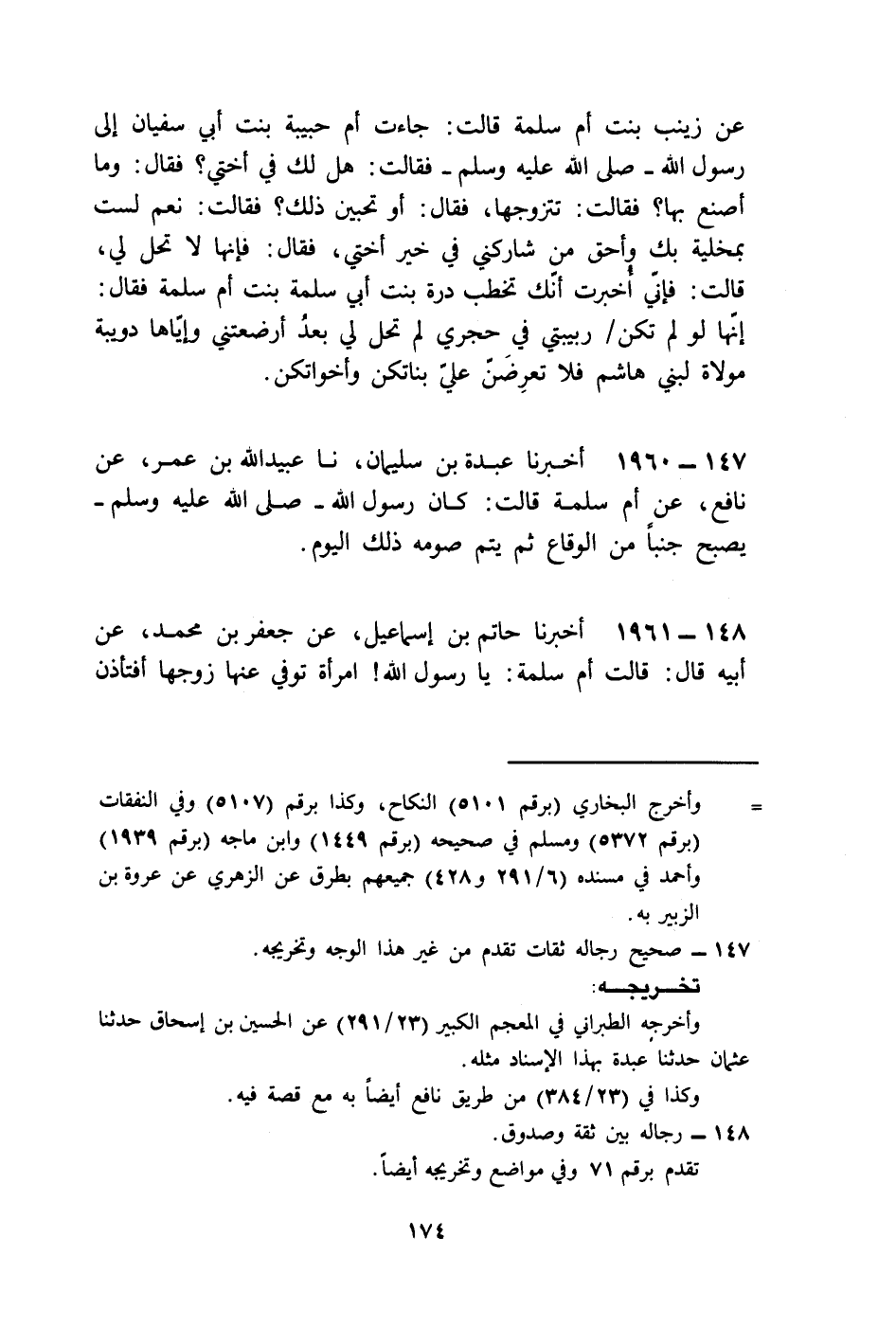 1960 - أَخْبَرَنَا عَبْدَةُ بْنُ سُلَيْمَانَ، نا عُبَيْدُ اللَّهِ بْنُ عُمَرَ، عَنْ نَافِعٍ، عَنْ أُمِّ سَلَمَةَ قَالَتْ: «كَانَ رَسُولُ اللَّهِ صَلَّى اللهُ عَلَيْهِ وَسَلَّمَ §يُصْبِحُ جُنُبًا مِنَ الْوِقَاعِ، ثُمَّ يُتِمُّ صَوْمَهُ ذَلِكَ الْيَوْمَ»
