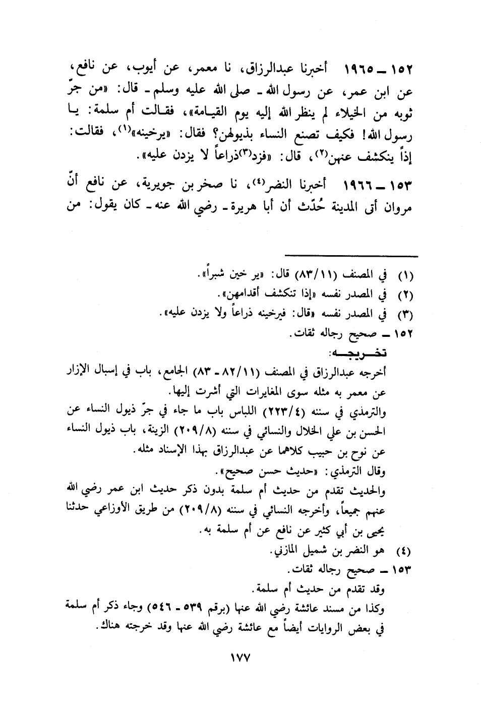 أَخْبَرَنَا عَبْدُ الرَّزَّاقِ، نا مَعْمَرٌ، عَنْ أَيُّوبَ، عَنْ نَافِعٍ، عَنِ ابْنِ عُمَرَ عَنْ رَسُولِ اللَّهِ صَلَّى اللهُ عَلَيْهِ وَسَلَّمَ قَالَ: " §مِنْ جَرَّ ثَوْبَهُ مِنَ الْخُيَلَاءِ لَمْ يَنْظُرِ اللَّهُ إِلَيْهِ يَوْمَ الْقِيَامَةِ فَقَالَتْ أُمُّ سَلَمَةَ: يَا رَسُولَ اللَّهِ، فَكَيْفَ تَصْنَعُ النِّسَاءُ بِذُيُولِهِنَّ، فَقَالَ: «يُرْخِينَهُ شِبْرًا» فَقَالَتْ: إِذًا يَنْكَشِفُ عَنْهُنَّ، قَالَ: «فَزِدْ ذِرَاعًا لَا يَزِدْنَ عَلَيْهِ»