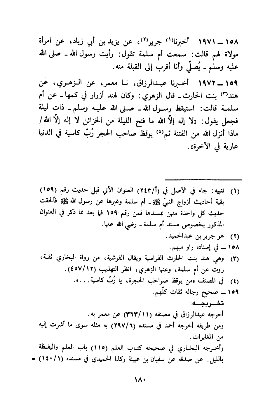1972 - أَخْبَرَنَا عَبْدُ الرَّزَّاقِ، نا مَعْمَرٌ، عَنِ الزُّهْرِيِّ، عَنْ هِنْدَ بِنْتِ الْحَارِثِ - قَالَ الزُّهْرِيُّ وَكَانَ لِهِنْدٍ أَزْرَارٌ فِي كُمِّهَا - عَنْ أُمِّ سَلَمَةَ قَالَتْ: " اسْتَيْقَظَ رَسُولُ اللَّهِ صَلَّى اللهُ عَلَيْهِ وَسَلَّمَ ذَاتَ لَيْلَةٍ فَجَعَلَ يَقُولُ: «§لَا إِلَهَ إِلَّا اللَّهُ مَا فُتِحَ اللَّيْلَةَ مِنَ الْخَزَائِنِ لَا إِلَهَ إِلَّا اللَّهُ، مَاذَا أَنْزَلَ اللَّهُ مِنَ الْفِتْنَةِ؟ ثُمَّ يُوقِظُ صَاحِبَ الْحَجَرِ، رُبَّ كَاسِيَةٍ فِي الدُّنْيَا عَارِيَةٌ فِي الْآخِرَةِ»