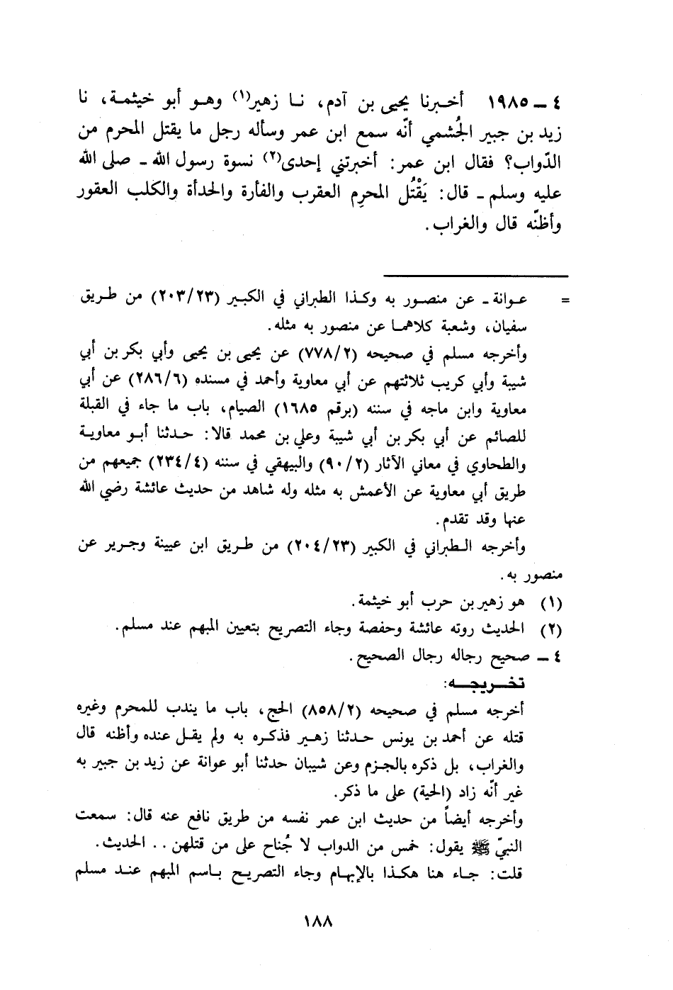1985 - أَخْبَرَنَا يَحْيَى بْنُ آدَمَ، نا زُهَيْرُ وَهُوَ أَبُو خَيْثَمَةَ , نا زَيْدُ بْنُ جُبَيْرٍ الْجُشَمِيُّ، أَنَّهُ سَمِعَ ابْنَ عُمَرَ وَسَأَلَهُ رَجُلٌ مَا يَقْتُلُ الْمُحْرِمُ مِنَ الدَّوَابِّ فَقَالَ ابْنُ عُمَرَ: أَخْبَرَتْنِي إِحْدَى نِسْوَةِ رَسُولِ اللَّهِ صَلَّى اللهُ عَلَيْهِ وَسَلَّمَ قَالَ: «§يَقْتُلُ الْمُحْرِمُ الْعَقْرَبَ وَالْفَأْرَةَ وَالْحِدَأَةَ وَالْكَلْبَ الْعَقُورَ» وَأَظُنُّهُ قَالَ «وَالْغُرَابَ»