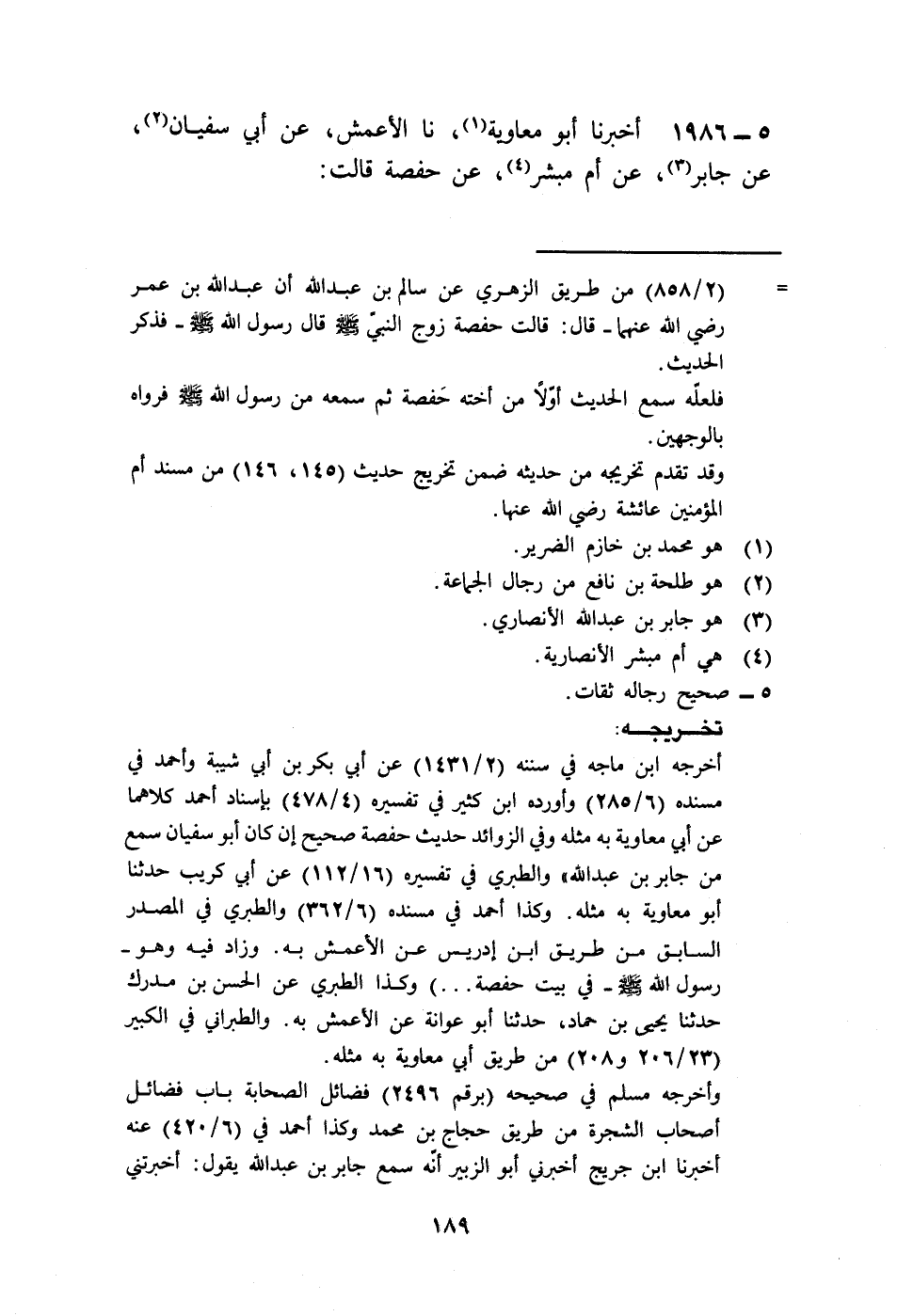 1986 - أَخْبَرَنَا أَبُو مُعَاوِيَةَ، نا الْأَعْمَشُ، عَنْ أَبِي سُفْيَانَ، عَنْ جَابِرٍ، عَنْ أُمِّ مُبَشِّرٍ، عَنْ حَفْصَةَ قَالَتْ -[190]-: قَالَ رَسُولُ اللَّهِ صَلَّى اللهُ عَلَيْهِ وَسَلَّمَ: «§إِنِّي لَأَرْجُو أَنْ لَا يَدْخُلَ النَّارَ أَحَدٌ شَهِدَ بَدْرًا وَالْحُدَيْبِيَةَ» قَالَتْ: فَقُلْتُ: يَا رَسُولَ اللَّهِ، أَلَيْسَ يَقُولُ اللَّهُ تَعَالَى: {وَإِنْ مِنْكُمْ إِلَّا وَارِدُهَا كَانَ عَلَى رَبِّكَ حَتْمًا مَقْضِيًّا} [مريم: 71] قَالَ: أَلَا تَرَيْنَ إِنَّهُ يَقُولُ: {ثُمَّ نُنَجِّي الَّذِينَ اتَّقَوْا وَنَذَرُ الظَّالِمِينَ فِيهَا جِثِيًّا} [مريم: 72] "