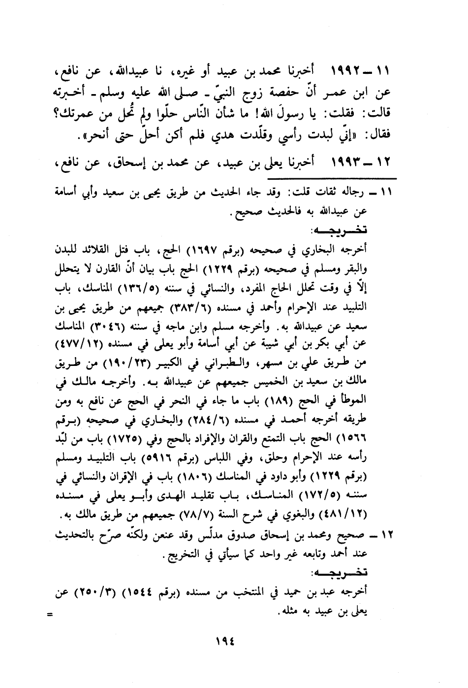 1992 - أَخْبَرَنَا مُحَمَّدُ بْنُ عُبَيْدٍ، أَوْ غَيْرُهُ، نا عُبَيْدُ اللَّهِ، عَنْ نَافِعٍ، عَنِ ابْنِ عُمَرَ، أَنَّ حَفْصَةَ زَوْجَ النَّبِيِّ صَلَّى اللهُ عَلَيْهِ وَسَلَّمَ أَخْبَرَتْهُ قَالَتْ: فَقُلْتُ: يَا رَسُولَ اللَّهِ، مَا شَأْنُ النَّاسِ حَلُّوا، وَلَمْ تُحِلَّ مِنْ عُمْرَتِكِ، فَقَالَ: «§إِنِّي لَبَّدْتُ رَأْسِي وَقَلَّدْتُ هَدْيً، فَلَمْ أَكُنْ أُحِلَّ حَتَّى أَنْحَرَ»