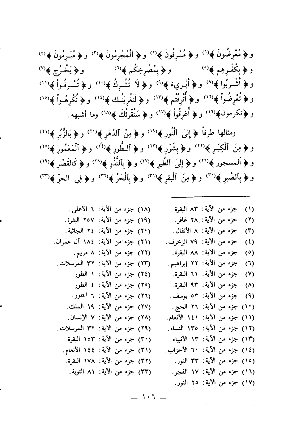 ومثالها طرفًا {إِلَى النُّورِ} (¬19) و {الدَّهْرِ} (¬20) و {وَبِالزُّبُرِ} (¬21) {مِنَ الْكِبَرِ} (¬22) و {بِشَرَرٍ} (¬23) و {وَالطُّورِ} (¬24) و {الْمَعْمُورِ} (¬25) {الْمَسْجُورِ} (¬26) و {إِلَى الطَّيْرِ} (¬27) و {بِالنُّذُرِ} (¬28) و {كَالْقَصْرِ} (¬29) {بِالصَّبْرِ} (¬30) و {مِنَ الْبَقَرِ} (¬31) و {بِالْحُرِّ} (¬32) و {فِي الْحَرِّ} (¬33)